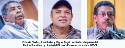 La UIT-CI, junto a los compañeros del PSL de Venezuela, encabezados por los históricos dirigentes socialistas Orlando Chirino, José Bodas y Miguel Ángel Hernández3, siempre dijimos que el chavismo, con Hugo Chávez y luego con Maduro, no iba a la ruptura con el capitalismo ni al socialismo. Nuestra corriente de la izquierda trotskista, fundada por Nahuel Moreno (1924-1987, ver nahuelmoreno.org), siempre fue independiente del gobierno chavista y alertó sobre los peligros que encerraba su conciliación con las multinacionales y los grandes empresarios. Siempre estuvimos acompañando las luchas del movimiento obrero y en la pelea contra la burocracia sindical chavista. Como consecuencia de nuestra posición independiente, en noviembre de 2008 sufrimos el asesinato de los dirigentes obreros Richard Gallardo, Luis Hernández y Carlos Requena, dirigentes de la UNETE, central obrera del estado de Aragua. Un sicario profesional los acribilló en un local de La Encrucijada, donde se encontraban cenando luego del triunfo de una huelga en esa zona. Gallardo era presidente de la UNETE-Aragua, Hernández secretario general del sindicato de la Pepsi Cola y Carlos Requena, delegado de Prevención de la empresa Produvisa. Los tres eran integrantes de nuestra corriente sindical Corriente Clasista Unitaria Revolucionaria Autónoma (CCURA) y de nuestro partido, ahora el PSL (ver laclase.info). El caso sigue impune.