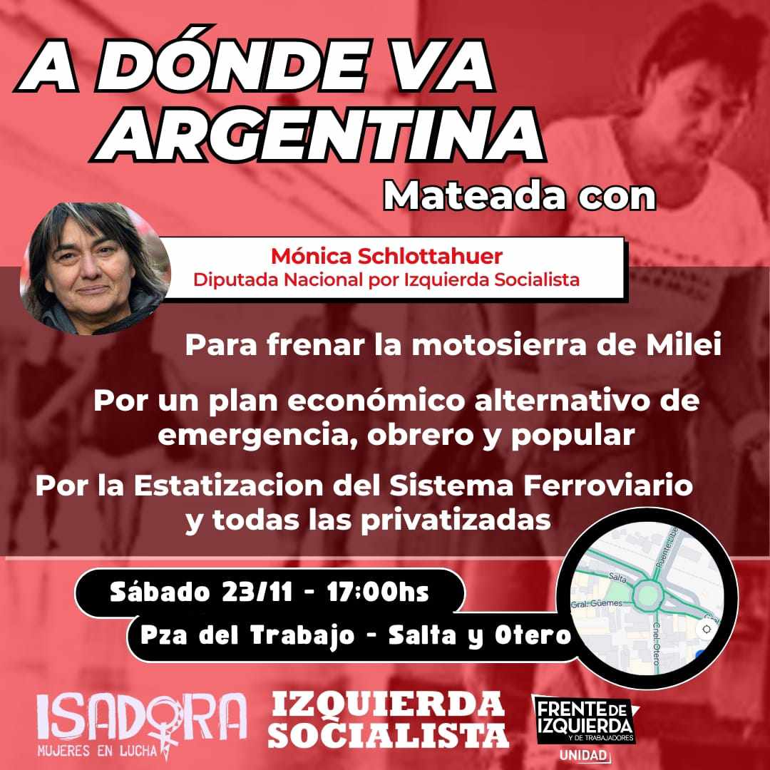 Este sábado 23 de noviembre la diputada nacional Mónica Schlotthauer (Izquierda Socialista/FITUnidad), visitará la Provincia de Jujuy y se quedará hasta el lunes 25 a la noche. Participará el mismo sábado a las 17hs. de una “Mateada" en Plaza del Trabajo” (Salta y Otero) donde se hablará "A donde va Argentina".