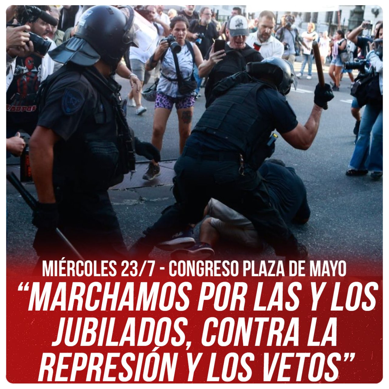 Este miércoles 23 de julio a las 15 horas las y los jubilados, junto a organismos de Derechos Humanos y otras organizaciones, convocan a una radio abierta en Plaza Congreso para luego marchar a Plaza de Mayo a las 16 horas. Se reclama un ingreso mínimo de 1.200.000 pesos en jubilaciones, contra la represión de Patricia Bullrich y el nuevo posible veto de Milei a las leyes aprobadas en el Congreso.