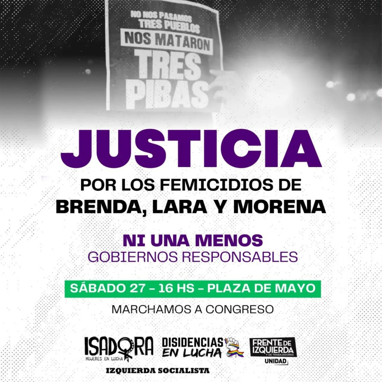 Este sábado 27 de septiembre a las 16 horas se convoca a una marcha de Plaza de Mayo a Congreso exigiendo justicia por el triple femicidio de Brenda, Lara y Morena.