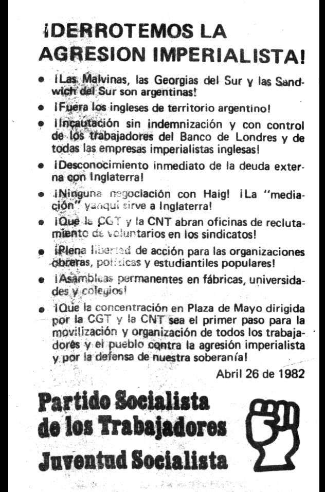 Tras el anuncio de la recuperación de Malvinas, el Partido Socialista de los Trabajadores (PST) antecesor de Izquierda Socialista, se ubicó por el triunfo argentino y la derrota inglesa, sin depositar ninguna confianza en la dictadura y denunciando sus crímenes. Su posición surgía de la caracterización de la guerra. Detrás de los distintos regímenes y gobiernos de ambos países, la guerra enfrentaba a un país imperialista: Gran Bretaña, que buscaba retener sus últimas colonias; contra un país oprimido: Argentina, semicolonial, sometido al imperialismo por el saqueo de multinacionales y la sangría de la deuda externa, que reclamaba la soberanía sobre su propio territorio.