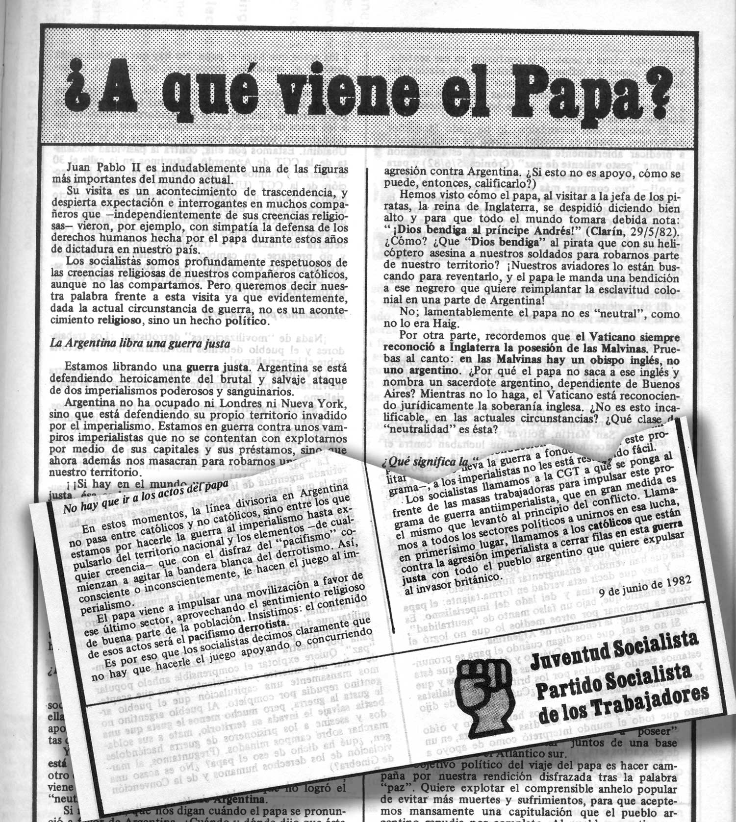 La Junta Militar, aterrada por la irrupción de la movilización antiimperialista, terminó eligiendo la derrota. La UCR y el PJ acompañaron la política derrotista. Carlos Contín, presidente de la UCR declaró: “es la hora de los grandes silencios”. La oportunidad de imponer la rendición en las calles la dio la llegada del Papa, Juan Pablo II, quien vino a predicar la “paz”, pero reconociendo la posesión inglesa de Malvinas. La UCR, el PJ y la CGT se sumaron a las misas masivas del 11 y 12 de junio. El PST en soledad llamó a no ir a los actos papales, denunciando que planteaban, en medio de la guerra, “nuestra rendición disfrazada tras la palabra paz”.3