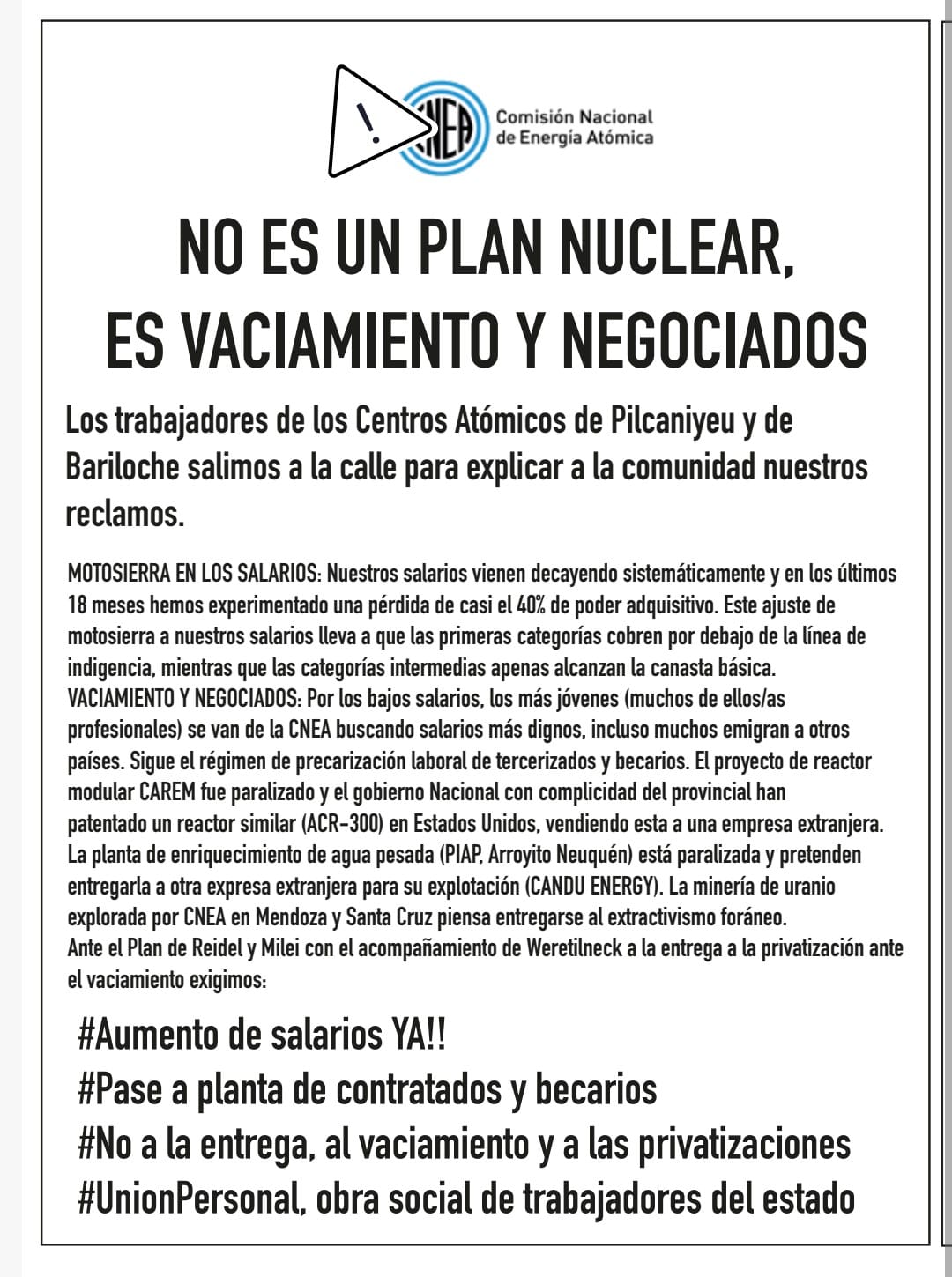 La Comisión Nacional de Energía Atómica (CNEA) vive una situación dramática, tanto en los Centros Atómicos (Bariloche, Constiyutentes y Ezeiza), como también en las diversas regionales (Mendoza, Córdoba, Salta, Trelew) y el complejo tecnológico de Pilcaniyeu.