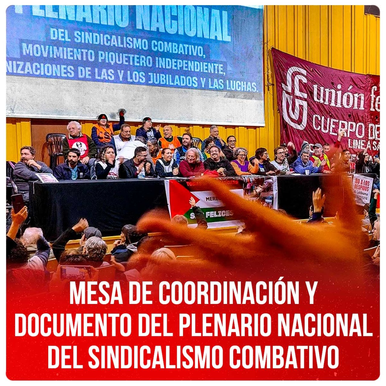 Desde las representaciones abajo firmantes llamamos a todo el sindicalismo combativo y a las organizaciones piqueteras combativas y de jubiladas y jubilados a impulsar juntos estas propuestas y a sumarse al plan de acción, las medidas de lucha y los plenarios regionales votados, como así también a la Mesa de Coordinación Nacional votada para llevarlas adelante.