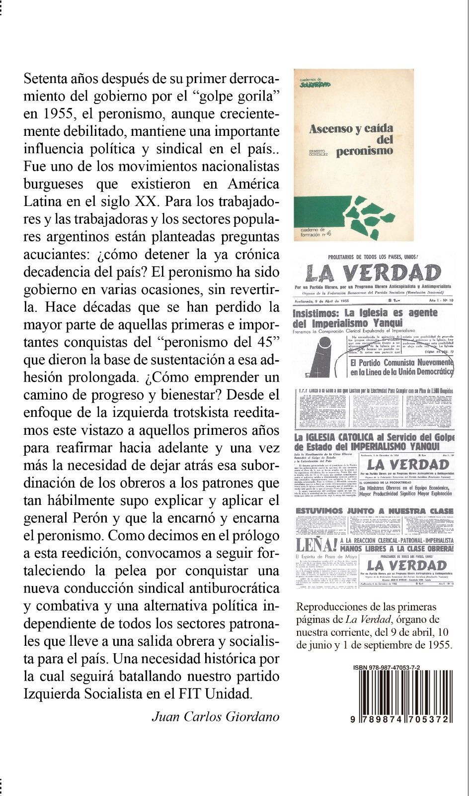 Setenta años después de su primer derrocamiento del gobierno por el “golpe gorila” en 1955, el peronismo, aunque crecientemente debilitado, mantiene una importante influencia política y sindical en el país. Fue uno de los movimientos nacionalistas burgueses que existieron en América Latina en el siglo XX. Para los trabajadores y las trabajadoras y los sectores populares argentinos están planteadas preguntas acuciantes: ¿cómo detener la ya crónica decadencia del país? El peronismo ha sido gobierno en varias ocasiones, sin revertirla. Hace décadas que se han perdido la mayor parte de aquellas primeras e importantes conquistas del “peronismo del 45” que dieron la base de sustentación a esa adhesión prolongada. ¿Cómo emprender un camino de progreso y bienestar? Desde el enfoque de la izquierda trotskista reeditamos este vistazo a aquellos primeros años para reafirmar hacia adelante y una vez más la necesidad de dejar atrás esa subordinación de los obreros a los patrones que tan hábilmente supo explicar y aplicar el general Perón y que la encarnó y encarna el peronismo. Como decimos en el prólogo a esta reedición, convocamos a seguir fortaleciendo la pelea por conquistar una nueva conducción sindical antiburocrática y combativa y una alternativa política independiente de todos los sectores patronales que lleve a una salida obrera y socialista para el país. Una necesidad histórica por la cual seguirá batallando nuestro partido Izquierda Socialista en el FIT Unidad.