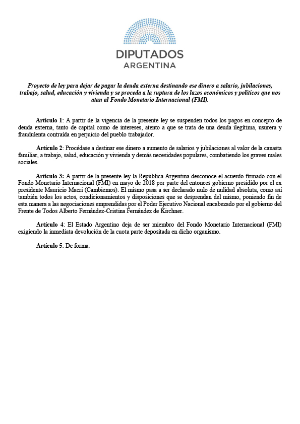 El proyecto presentado por nuestro bloque de Izquierda Socialista dispone en su articulado “que se suspenden todos los pagos en concepto de deuda externa, tanto de capital como de intereses, atento a que se trata de una deuda ilegítima, usurera y fraudulenta”; procede a “destinar ese dinero a aumento de salarios y jubilaciones al valor de la canasta familiar, a trabajo, salud, educación y vivienda y demás necesidades populares” y a la vez “desconoce el acuerdo firmado con el Fondo Monetario Internacional (FMI) en mayo de 2018 por parte del entonces gobierno de Macri (Cambiemos)”, al que lo declara “nulo de nulidad absoluta”.