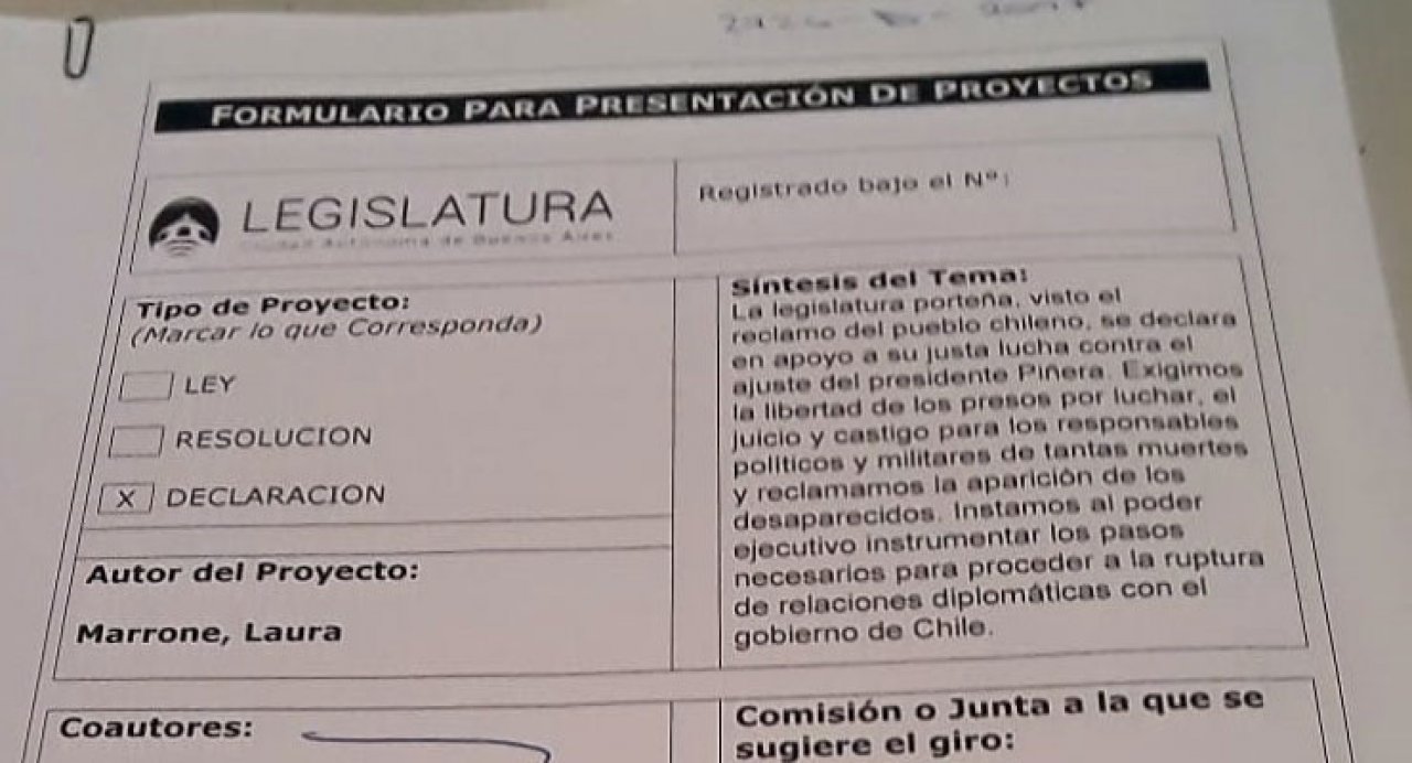 El proyecto que lleva el número 2726-D-2019, enuncia: "La legislatura porteña, visto el reclamo del pueblo chileno, se declara en apoyo a su justa lucha contra el ajuste del presidente Piñera. Exigimos la libertad de los presos por luchar, el juicio y castigo para los responsables políticos y militares de tantas muertes y reclamamos la aparición de los desaparecidos. Instamos al poder ejecutivo instrumentar los pasos necesarios para proceder a la ruptura de relaciones diplomáticas con la Republica de Chile, de forma de quitar por parte de nuestro país cualquier tipo de colaboración con un gobierno ilegítimo y represor.