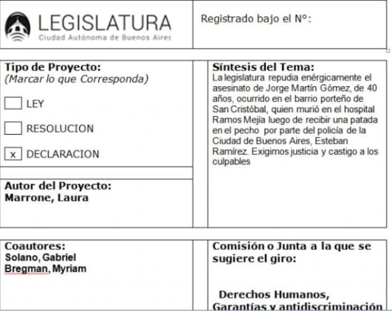 La Legisladora Laura Marrone (Izquierda Socialista) junto a Myriam Bregman (PTS) y Gabriel Solano (PO) presentaron en al Legislatura porteña un repudio al asesinato de Jorge Martín Gómez, de 40 años, ocurrido en el barrio porteño de San Cristóbal, quien murió en el hospital Ramos Mejía luego de recibir una patada en el pecho por parte del policía de la Ciudad de Buenos Aires, Esteban Ramírez. Exigimos justicia y castigo a los culpables.