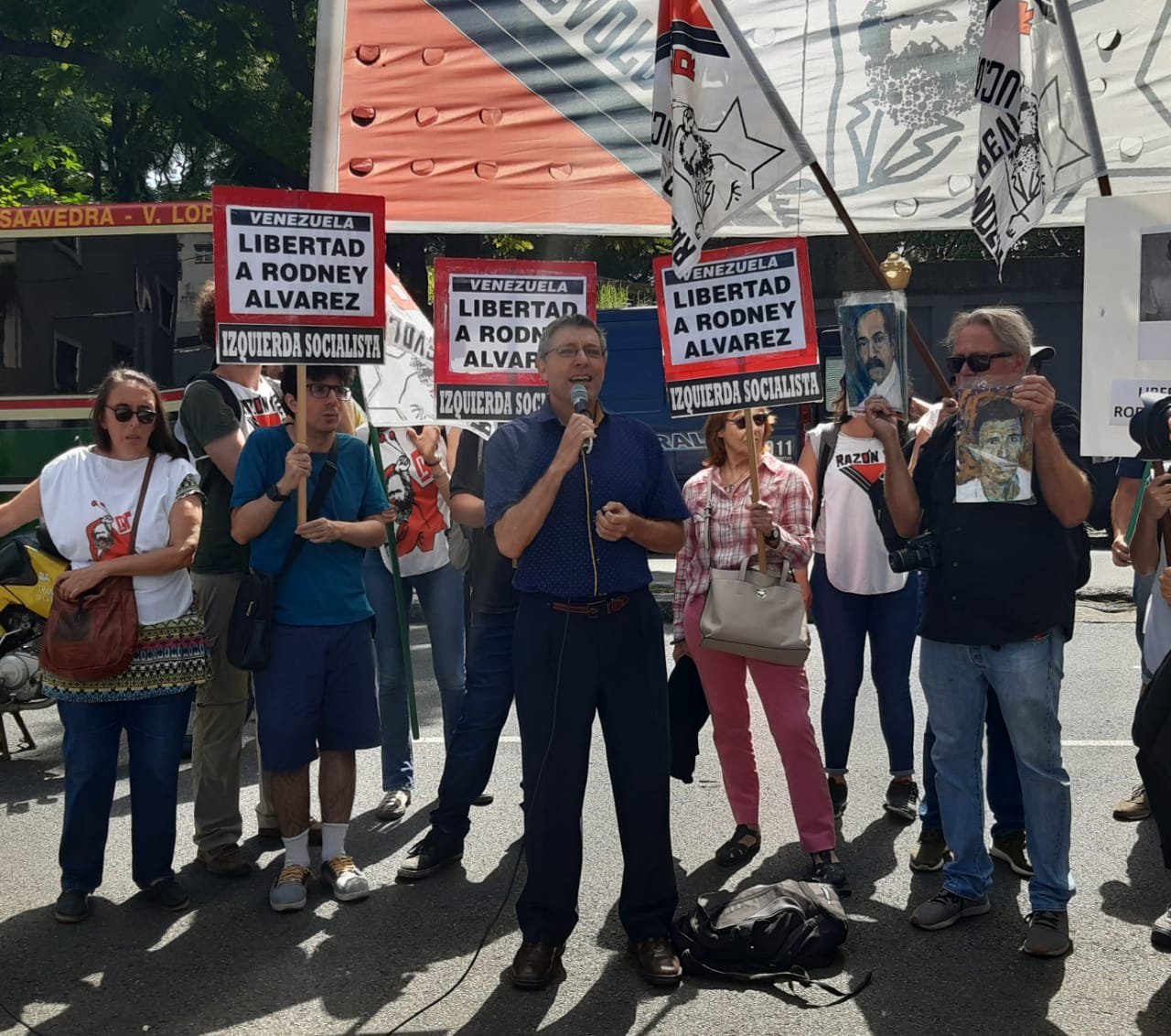 Giordano señaló: "Concurrimos a reclamar por la libertad del obrero Rodney Álvarez de Ferrominera Orinoco, falsamente acusado de matar a un trabajador durante una asamblea. Las evidencias apuntan como responsables a directivos sindicales y políticos del PSUV. Alvarez está preso por un crimen que no cometió, sin pruebas, ni sentencia. Ahora se encuentra realizando una huelga de hambre mientras espera juicio desde hace 8 años. Exigimos su libertad inmediata y repudiamos la criminalización de la protesta en dicho país por parte del gobierno de Maduro.”