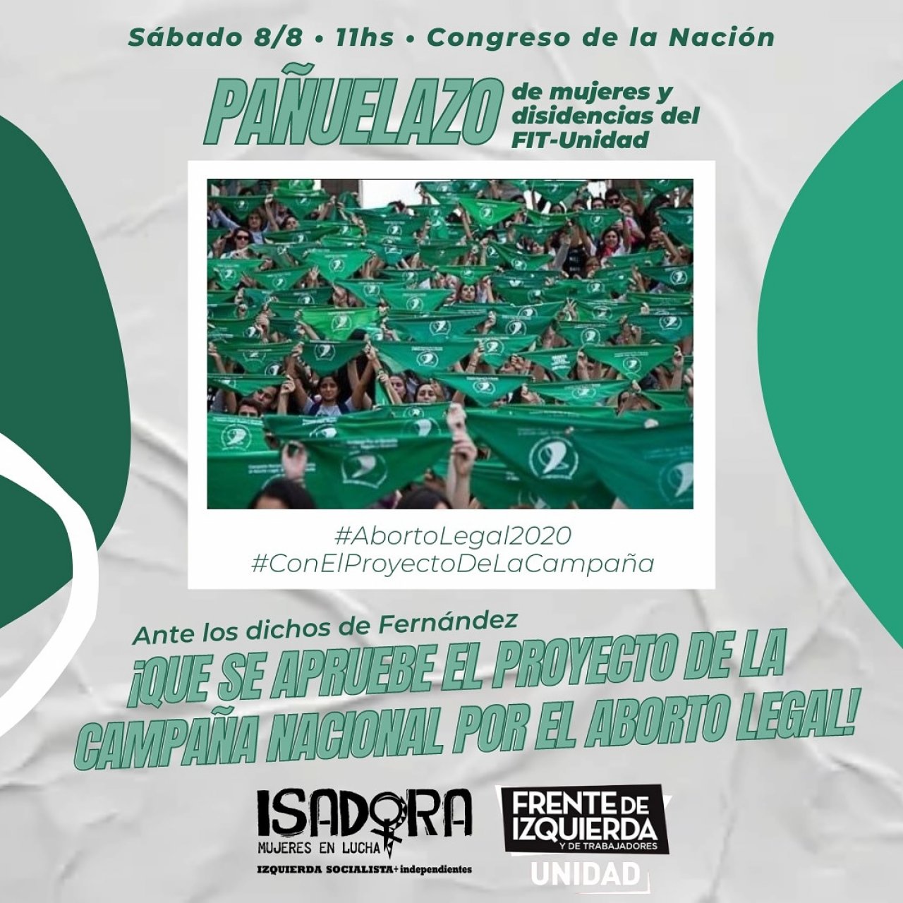 El sábado 08 de Agosto a las 11 hs se concentrarán las agrupaciones conglomeradas en el Frente de Izquierda Unidad frente al Congreso para realizar un pañuelazo verde, a dos años de que el senado vetara la ley por el aborto legal seguro y gratuito. De la misma participarán distintas referentes del movimiento de mujeres y la izquierda, entre ellas Mercedes Trimarchi, diputada provincial (M.C) de Izquierda Socialista en el FIT-U y Mercedes de Mendietta, legisladora electa CABA por Izquierda Socialista en el FIT-U. Ambas parte de la campaña nacional por el derecho al aborto.