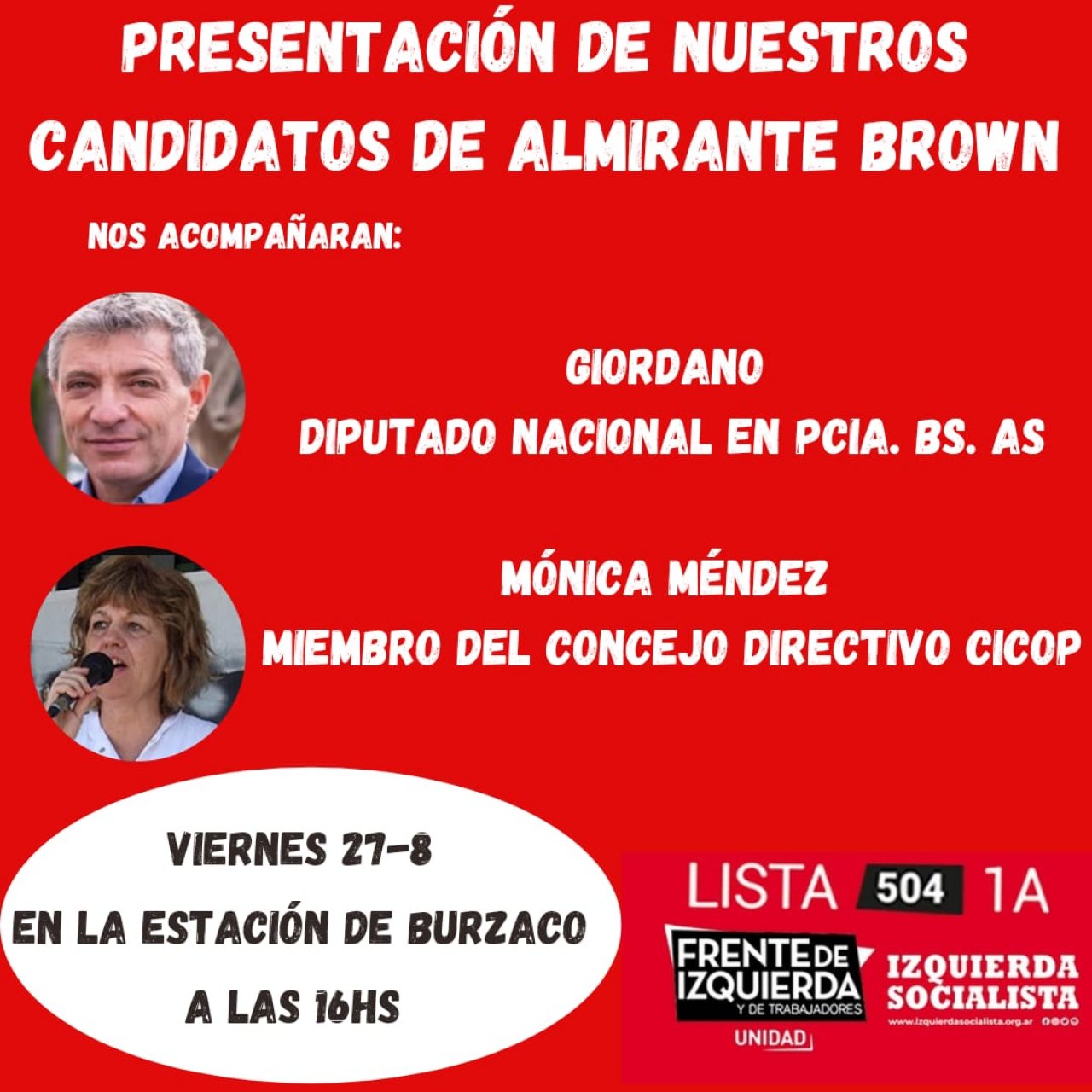 Juan Carlos Giordano, actual diputado nacional por Izquierda Socialista en el Frente de Izquierda Unidad y precandidato al mismo cargo en la lista 1A del FIT-U que encabeza Nicolás Del Caño en provincia de Buenos Aires, estará este viernes 27 de agosto en la plaza de Burzaco presentando los candidatos zonales a las 16 horas. Y desde las 15, Giordano participará junto a la militancia de la unidad de la izquierda de un acto de difusión y conversatorio con vecinos de la zona. Lo hará junto a Mónica Méndez, dirigente de la Salud-Cicop y precandidata a concejal en la lista 1A FITU de Almirante Brown.