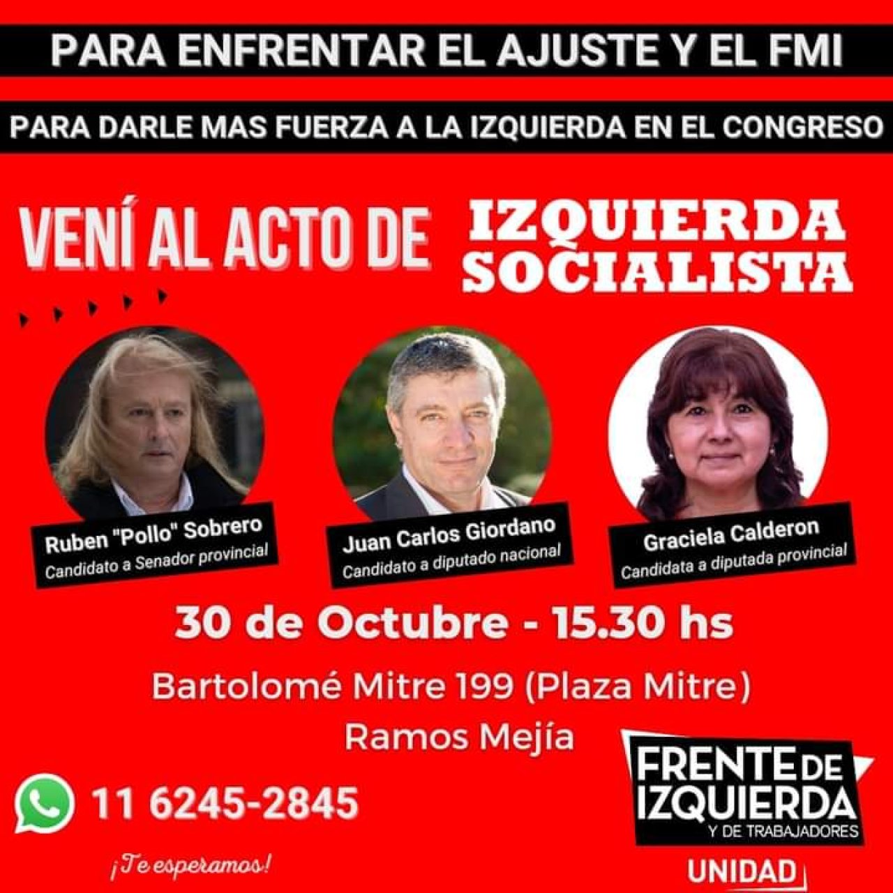 Este sábado 30 de octubre a las 15:30 se llevará a cabo el acto de Izquierda Socialista en el Frente de Izquierda Unidad para impulsar el voto por diputadas y diputados de izquierda. Será en Ramos Mejía en la Plaza Mitre (Bartolomé Mitre 199).