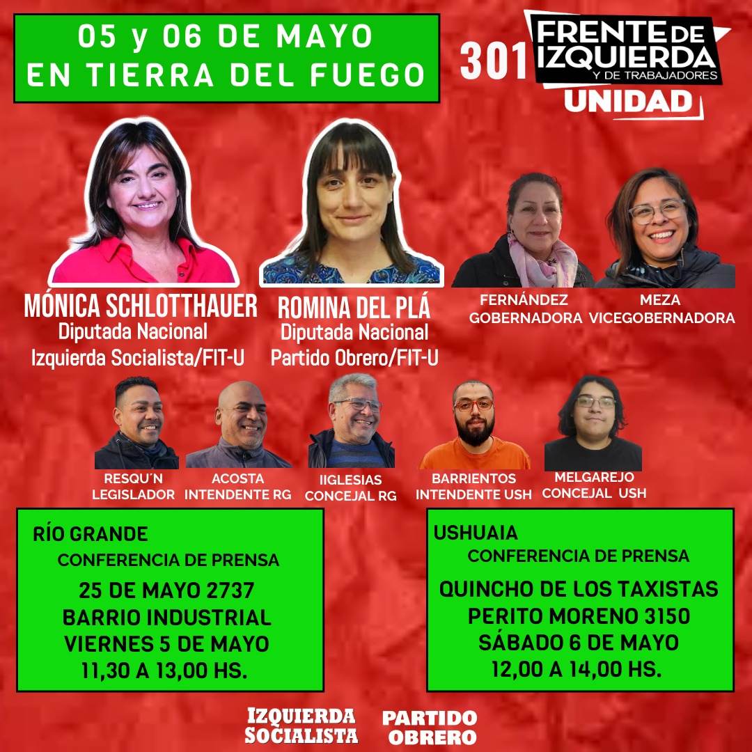 El viernes 5 de mayo se llevará a cabo una conferencia de prensa de 11:30 a 13 horas en 25 de mayo 2737 (Barrio Industrial - Río Grande). En la conferencia además de la diputada nacional electa de Izquierda Socialista / FIT Unidad Mónica Schlotthauer, hablarán María Meza (candidata a vicegobernadora), Germán Resquín (candidato a legislador) y Hugo Iglesias (candidato a concejal en Río Grande), entre otros. Estará presente también la diputada nacional del Partido Obrero / FIT Unidad Romina del Pla. El mismo día a las 20 horas se llevará a cabo un gran acto del Frente de Izquierda Unidad en "Dionisio Teatro" de Río Grande (Seriot 853 - margen sur).