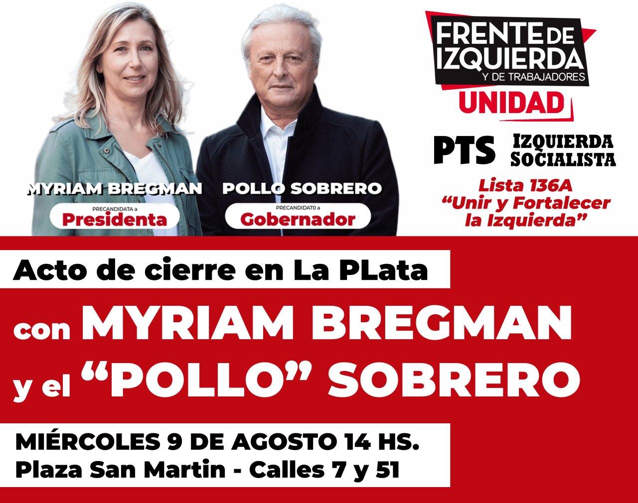 Este miércoles 9 de agosto a las 14 hs. en Plaza San Martín (Calles 7 y 51, La Plata) el precandidato a gobernador por Izquierda Socialista en el FIT Unidad, Rubén "Pollo" Sobrero, compartirá el acto de cierre en provincia de Buenos Aires con Myriam Bregman precandidata a presidenta en la Lista 136A del FIT Unidad junto a toda la militancia de la lista PTS-Izquierda Socialista y el resto de las y los candidatos locales.