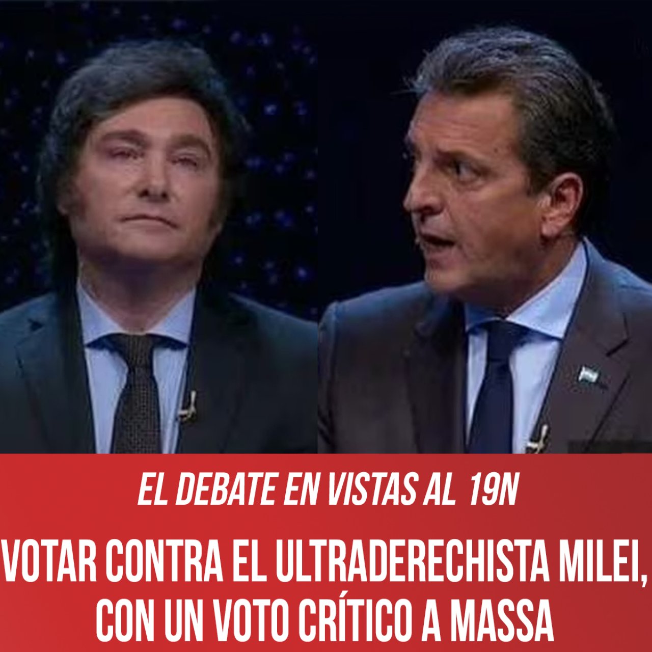 Hay que derrotar a Milei (en una elección abierta con resultado incierto) votando críticamente a Massa, con el único objetivo de que no gane un ultraderechista. Un voto crítico que significa no darle ningún apoyo ni aval político a Massa, ni a su gobierno, ni a un próximo gobierno, sea el que sea, al que tendremos que enfrentar en las calles. Porque sabemos que solo rompiendo los lazos con el FMI, dejando de pagar la usurera deuda externa e implementando un plan económico obrero y popular como postulamos desde Izquierda Socialista y el FIT Unidad, se combatirán los males sociales que sufre el pueblo trabajador. ¡Votemos este domingo contra el ultraderechista Milei, con un voto crítico a Massa!