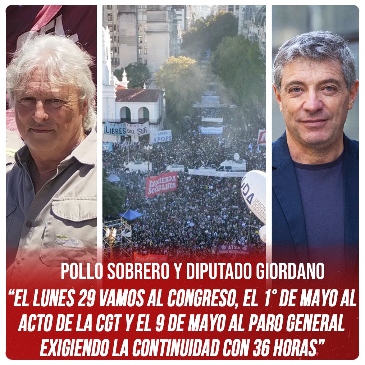 Sobrero y Giordano finalizaron: “La CGT ha convocado a un acto el 1 de Mayo y al paro general del 9 de Mayo. Desde Izquierda Socialista, sin depositar ninguna confianza en estos dirigentes, convocamos a participar del acto del 1° de Mayo de manera independiente. Llamando a garantizar un gran paro el 9 y exigiendo a la CGT y CTA que le den continuidad con un nuevo paro activo de 36 horas. Porque con un plan de lucha sostenido podemos derrotar el plan motosierra de Milei, siguiendo el camino de la unitaria y masiva marcha educativa que fue un ejemplo de cómo enfrentar el ajustazo del gobierno. ¡Plata hay! Que vaya a salarios, jubilaciones y a la educación, no para el FMI.”