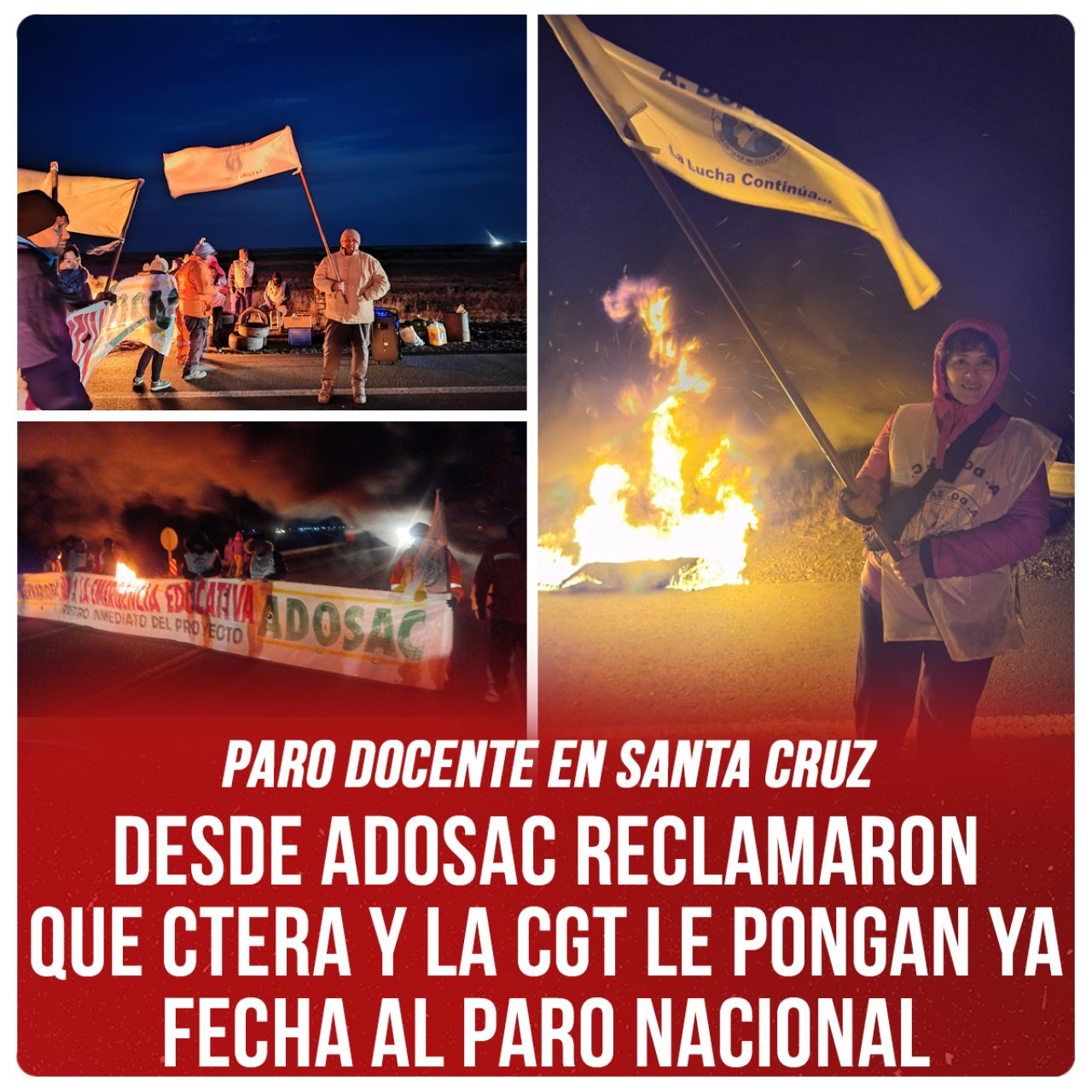 Por su parte Luis Díaz, secretario Gremial de ADOSAC Rio Gallegos, también dirigente de Docentes en Marcha e izquierda Socialista, desde el corte de ruta dijo: “Desde Santa Cruz llamamos a apoyar nuestra lucha docente, la de jubilados y demás trabajadores. Exigimos que la CTERA y la CGT llamen ya al paro nacional. ¡Hay que unificar las luchas para decir basta de Milei y su ajuste! ¡Fuera la Bullrich! Plata para educación, salarios y jubilaciones, no para el FMI”.