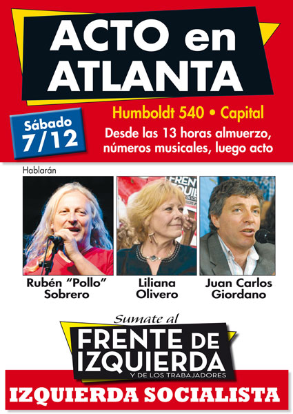 El próximo sábado 7 de diciembre te esperamos con tu familia, compañeros de trabajo, universidad, escuela o barrio en el acto que hará nuestro partido, Izquierda Socialista -con quien junto al Partido Obrero y el Partido de los Trabajadores Socialistas (PTS) conformamos el Frente de Izquierda-. Un acto para festejar el gran logro de haber llegado al Congreso nacional con varios diputados nacionales, y entrado con muchos legisladores en varias provincias, incluso hasta con senadores. Un hecho inédito e histórico para la izquierda.