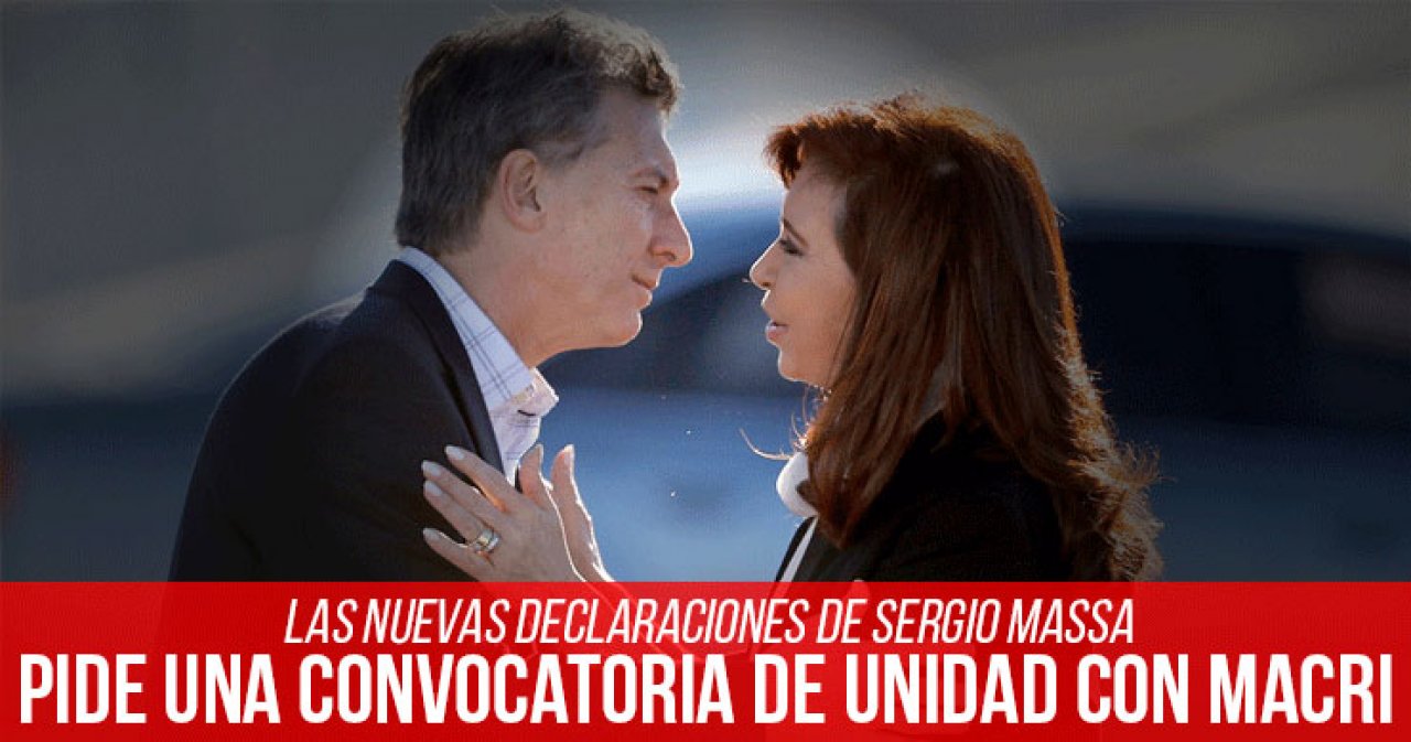 El líder del Frente Renovador y precandidato de Alternativa Federal, Sergio Massa, propuso que el presidente Macri haga una convocatoria a toda la oposición para salir de la crisis. Lo novedoso es que le pidió explícitamente al gobierno que convoque a Cristina. “Hay que tomar medidas excepcionales. Mauricio Macri debe convocar a Cristina Fernández de Kirchner como líder de la oposición con mayor representación parlamentaria, y pactar cómo termina este mandato sin más daños para la Argentina”, reclamó Sergio Massa, que propone que se conforme una mesa multisectorial que también incluya a los gobernadores, los empresarios, la CGT y los obispos de la Iglesia Católica.