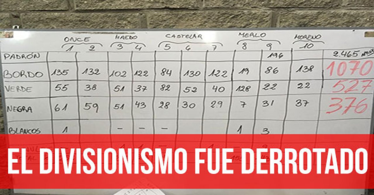 El divisionismo irresponsable salió derrotado. La base ferroviaria le propinó un duro revés a la Lista Negra que se presentó contra el Pollo Sobrero y la Bordó, obteniendo solo 376 votos, saliendo última (ver nota central).