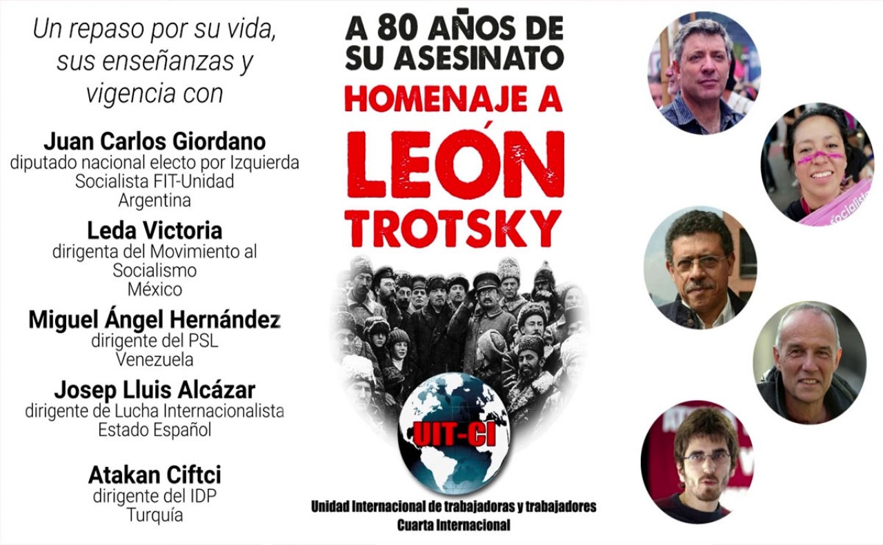 El lunes 17 de agosto, la Unidad Internacional de Trabajadoras y Trabajadores – Cuarta Internacional realizó, en simultáneo para varios países y traducido en cuatro idiomas, un homenaje a León Trotsky en el 80° aniversario de su asesinato. El homenaje promovió un repaso por su vida, sus enseñanzas y la vigencia de sus planteos revolucionarios. Miguel Ángel Hernández, del PSL de Venezuela, reivindicó su rol dirigente en la Revolución Rusa junto a Lenin, ante las falsificaciones estalinistas. Atakan Ciftci, del IDP de Turquía, resaltó su lucha contra la burocracia estalinista y la importancia de la fundación de la Cuarta Internacional. Josep Lluís Alcázar, de LI del Estado español, explicó el significado político de la persecución a los trotskistas y del asesinato de Trotsky por parte del estalinismo que, en su rol contrarrevolucionario, buscó cortar la continuidad revolucionaria. Leda Victoria, del MAS de México, relató la actividad revolucionaria de Trotsky en su exilio en ese país, quien aún, bajo las difíciles condiciones que vivía, siguió fiel a sus concepciones revolucionarias y su optimismo respecto de la clase trabajadora. Finalmente, Juan Carlos Giordano, de Izquierda Socialista de la Argentina, relató las peleas que dio el dirigente argentino Nahuel Moreno en la defensa de los principios y la política trotskista frente al revisionismo oportunista que hegemonizó la dirección del movimiento trotskista de posguerra, encabezado por los dirigentes Michel Pablo y Ernest Mandel, y a los grupos sectarios que surgieron como respuesta equivocada a ellos. Destacó que la UIT-CI impulsa la continuidad de los planteos revolucionarios de Trotsky y, al calor de las luchas en todo el mundo, donde surgen nuevas luchadoras y luchadores, postula una alternativa política de trabajadores y trabajadoras que pelee contra los aparatos contrarrevolucionarios que desvían las luchas y las llevan a la derrota, llamando a unir a los revolucionarios en la tarea por reconstruir la Cuarta Internacional.