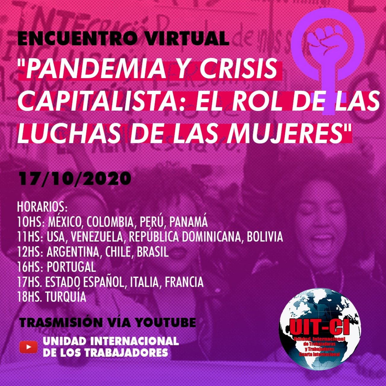 La Unidad Internacional de Trabajadoras y Trabajadores-Cuarta internacional (UIT-CI) está organizando para el sábado 17 de octubre a las 12, hora de Argentina, un encuentro de mujeres virtual en el que se destacarán las luchas feministas en este contexto de pandemia. Podés inscribirte aquí