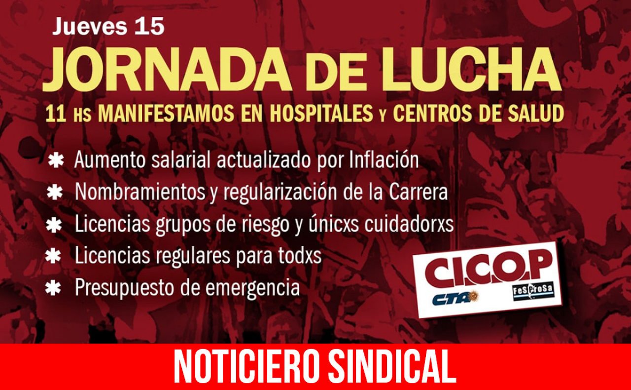 Este jueves 15, la Cicop vuelve a reclamarle al gobierno de Kicillof. Luego de meses sin discusión salarial y sin obtener respuesta a este y otros reclamos, el congreso de delegados votó un plan de lucha con varias acciones. El jueves se realizarán manifestaciones en los hospitales y centros de salud. Se está preparando una caravana hacia La Plata en la semana del lunes 22 y el martes 23 vuelven a realizar un congreso de delegados. Reclaman aumento salarial actualizado por inflación, nombramientos, licencias para grupos de riesgo y únicos cuidadores, licencias regulares para todos y presupuesto de emergencia. En el congreso volvieron a ratificar la exigencia de que se deje de pagar la deuda y se aplique un impuesto a las grandes riquezas y rentas, medida necesaria para solucionar la situación crítica del sistema público de salud y de las y los trabajadores.