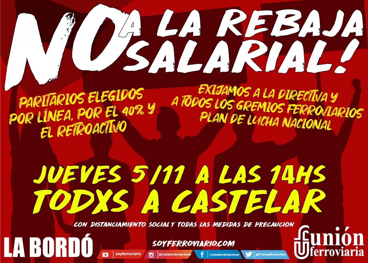 Como muestra de repudio a esta entrega salarial, desde el cuerpo de delegados de la línea Sarmiento y la Bordó Nacional, convocamos para el próximo jueves 5 a las 14 a una concentración en repudio en la base Castelar a todos los ferroviarios de las distintas líneas, sin distinción de colores gremiales. Y, además, para coordinar entre todos la exigencia de un aumento de salarios de 40%, el pago de los retroactivos que nos están robando, elección de paritarios votados por la base y un plan de lucha de todas las líneas, de cara a diciembre, donde se vuelve a reunir la mesa de negociación paritaria.