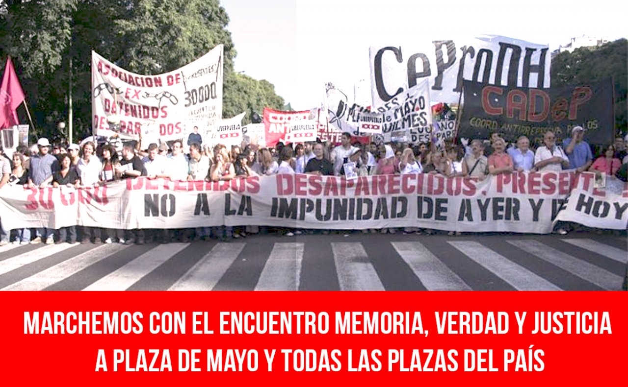 Otro 24 de marzo. Como todos los años es una cita de honor. Nos convoca el grito de siempre: ¡no olvidamos, no perdonamos, no nos reconciliamos! Allí estaremos, junto a los que nunca se dejaron cooptar: los organismos de derechos humanos, los sindicatos combativos, los centros de estudiantes, las organizaciones barriales y de desocupados y los partidos de izquierda que conformamos el Encuentro Memoria, Verdad y Justicia. Luchando por la memoria de los 30.000. Exigiendo justicia, contra la impunidad que vergonzosamente, sigue existiendo para tantos genocidas. Denunciando al gobierno, que, como todos los anteriores, se niega a abrir los archivos de la dictadura. Exigiendo cárcel común para los genocidas, muchísimos de los cuales están cómodamente en sus casas.