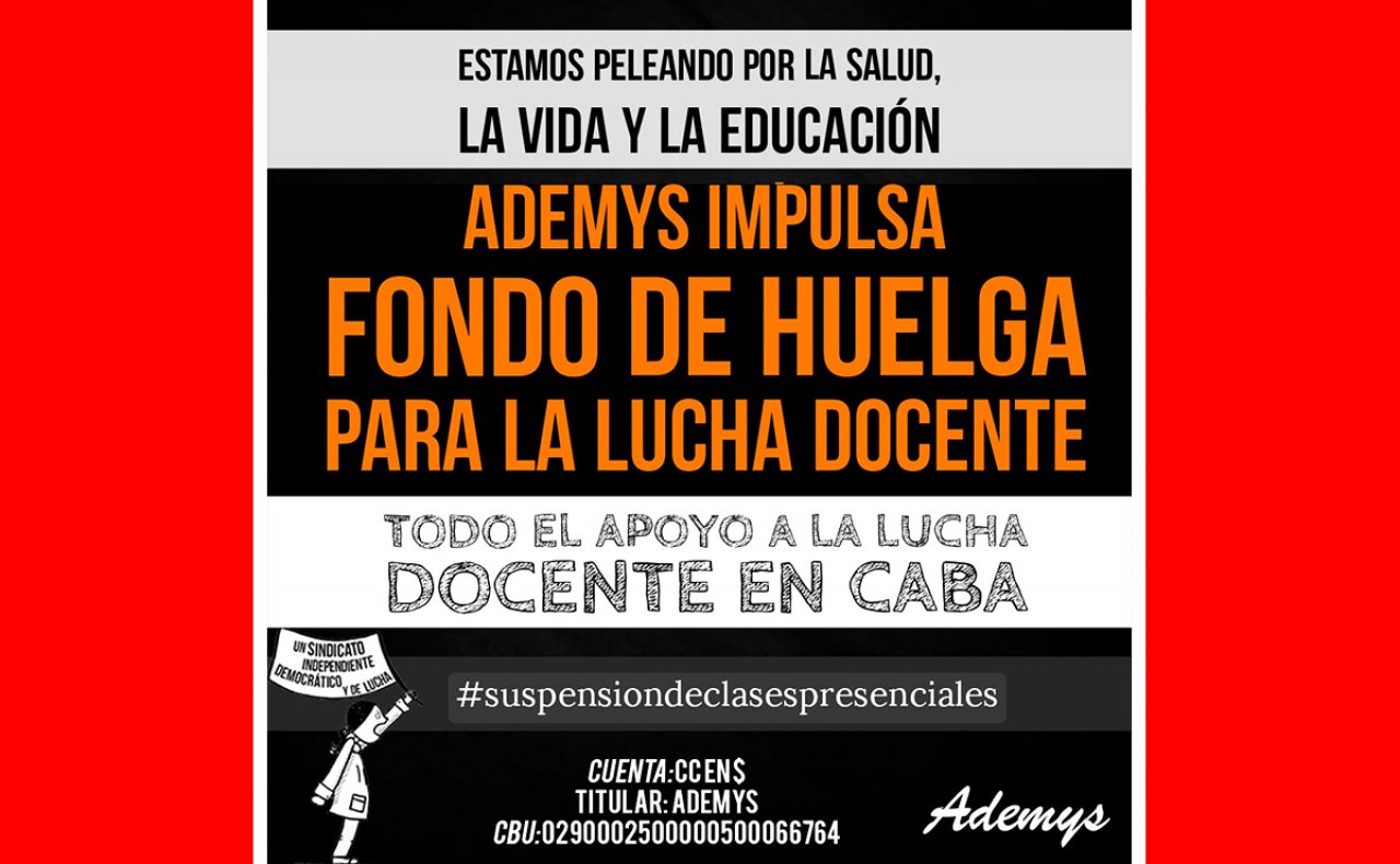 Por eso Ademys votó la conformación de un fondo de huelga para evitar que Larreta quiebre el paro por hambre. Ya centenares de personas han aportado, muchos sindicatos combativos (a los cuales Ademys siempre ha apoyado en sus luchas) y organizaciones sociales y políticas también. La directiva de Ademys depositó 2.500.000 pesos de los fondos del sindicato, es un gran ejemplo. ¡La plata del sindicato es para las luchas, no para prebendas! Llamamos a apoyar esta enorme lucha, a que las familias no envíen a los chicos y a seguir aportando al fondo de huelga.