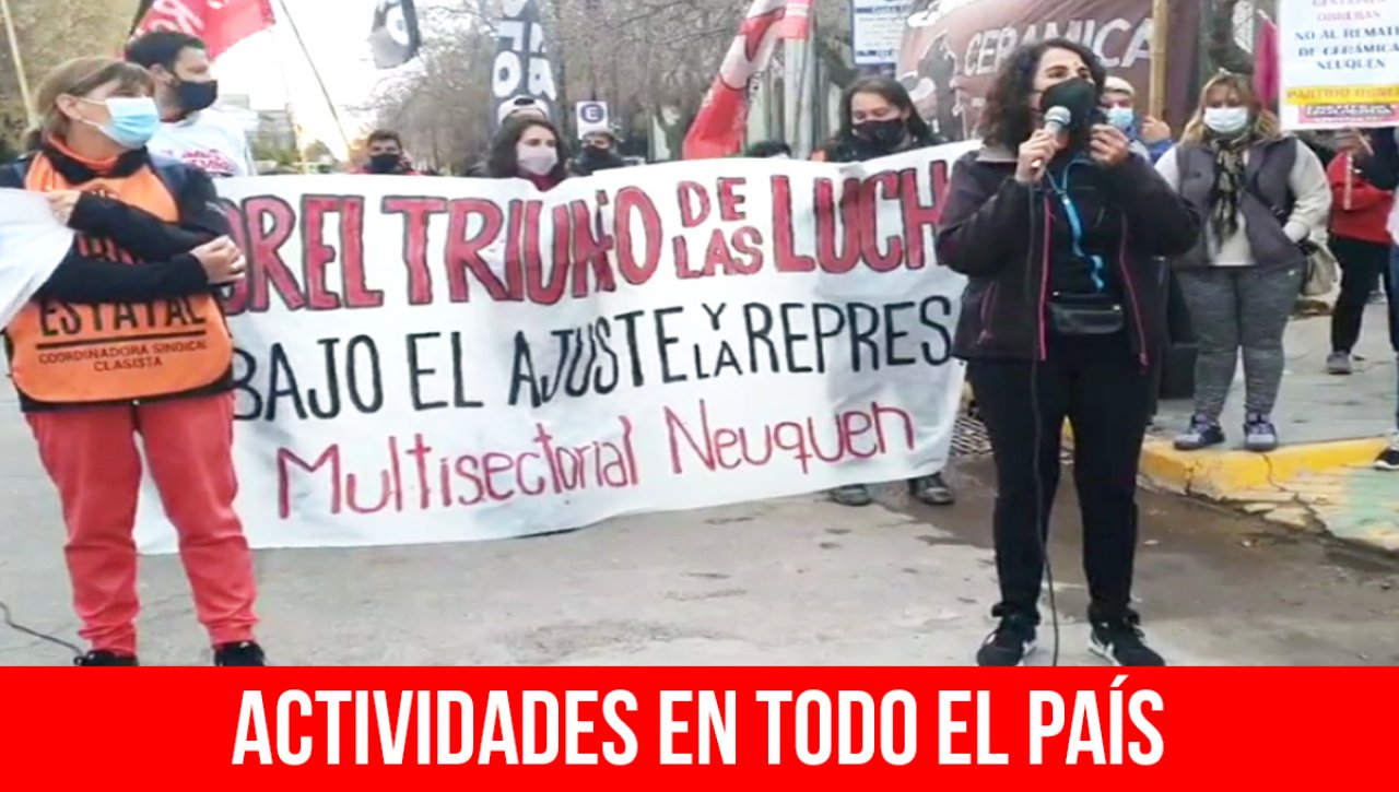La jornada también tuvo su réplica en numerosas provincias donde hubo marchas, actos, radios abiertas y actividades virtuales. En Santa Cruz se destacó el paro docente de Adosac. Los docentes de Amsafe, en Rosario, y los autoconvocados docentes de La Rioja se sumaron a la jornada. En Neuquén hubo una movilización de más de mil compañeros, con los ceramistas encabezados por Alejandro López, sectores de municipales de Centenario, de autoconvocados de la salud y la oposición de ATEN, entre otros. Nuestra compañera Angélica Lagunas dijo en el acto unitario: “Desde las minorías de ATEN y las seccionales opositoras somos parte de la jornada nacional de lucha del Plenario del Sindicalismo Combativo. Para denunciar al gobierno, su ajuste y a las burocracias sindicales cómplices.