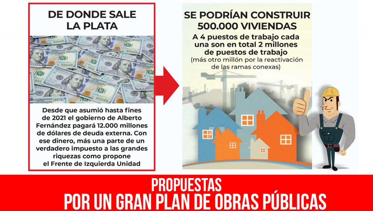 Una de nuestras propuestas para superar el desempleo, mejorar el salario y reactivar la economía es elaborar un gran plan de obras públicas que contemple la construcción y reparación de escuelas, hospitales y que tenga como eje resolver el déficit habitacional, un problema crónico que alcanza a casi cuatro millones de familias y continúa creciendo. De ese total, 1,5 millones de hogares necesitan una nueva vivienda, el resto habita en casas construidas con materiales inadecuados, sin servicios o en condiciones de hacinamiento.