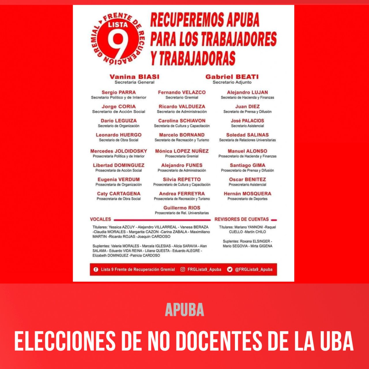 El 7 de abril se realizarán las elecciones de comisión directiva del gremio Apuba para el periodo 2022-2026. Se presentan dos listas, el Frente Marrón que dirige Jorge Anro desde hace ya 28 años y por otro lado el Frente de Recuperación Gremial lista 9, la oposición antiburocrática (conformada por la agrupación Bordó No docentes, la René Salamanca, la agrupación No docentes de base-FADU y la agrupación No docentes en lucha más independientes).