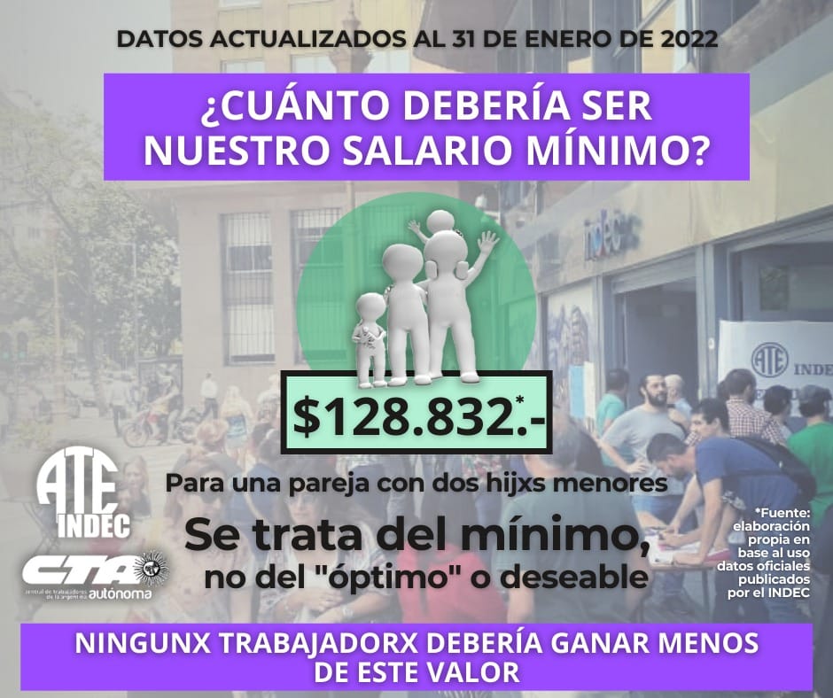 La Junta Interna de ATE Indec calcula, mes a mes, el salario de bolsillo necesario para que un hogar, constituido por una pareja de 35 años con dos menores, logre satisfacer las necesidades básicas.