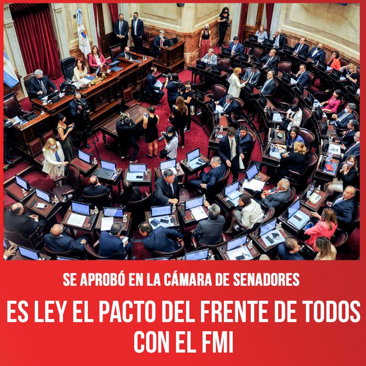 Con una clara señal a favor del FMI, de los grandes empresarios y de los medios de comunicación hegemónicos, tanto senadores de Juntos por el Cambio como oficialistas de todos los bloques aprobaron la Ley de Reestructuración que habilita al gobierno de Alberto Fernández a cumplir metas con el FMI, y establece el sendero de pagos de la gigantesca, ilegítima, y “odiosa” deuda externa contraída por Macri que deberá afrontar Argentina.