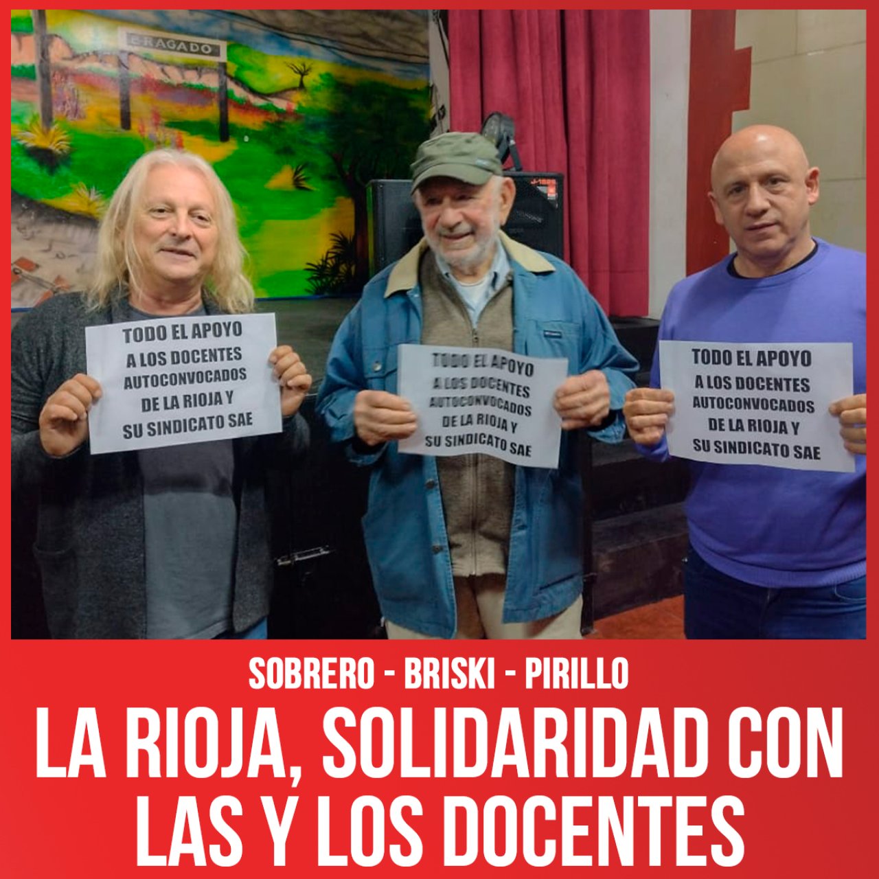 El Pollo Sobrero (secretario general Unión Ferroviaria Oeste), Norman Briski (actor) y Victorio Pirillo (secretario general Municipales Vicente López), junto a delegados ferroviarios, se solidarizaron con la lucha de los docentes riojanos y con los coordinadores del Sindicato de Autoconvocados de la Educación Carolina Goycochea, Javier Flores y Ariel Mendoza, que viajaron a Buenos Aires a buscar solidaridad.