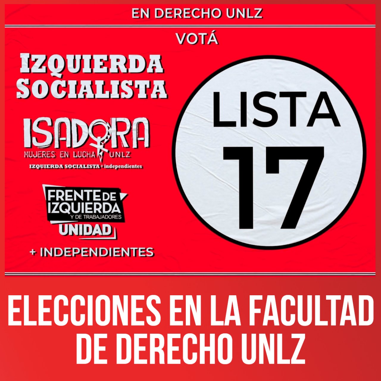 Del 6 al 9 de septiembre se realizarán elecciones para el Centro de Estudiantes y Claustros Estudiantiles de la Facultad de Derecho de la Universidad Nacional de Lomas de Zamora (UNLZ). Desde Izquierda Socialista presentamos la única lista que propone luchar contra la burocracia de la JUP, por un movimiento estudiantil independiente de las autoridades de la universidad y de los gobiernos, que sea democrático, que luche en defensa de la educación pública y apoye las luchas de la clase trabajadora contra el ajuste de los gobiernos y el FMI. Votá lista 17 (Izquierda Socialista e independientes)