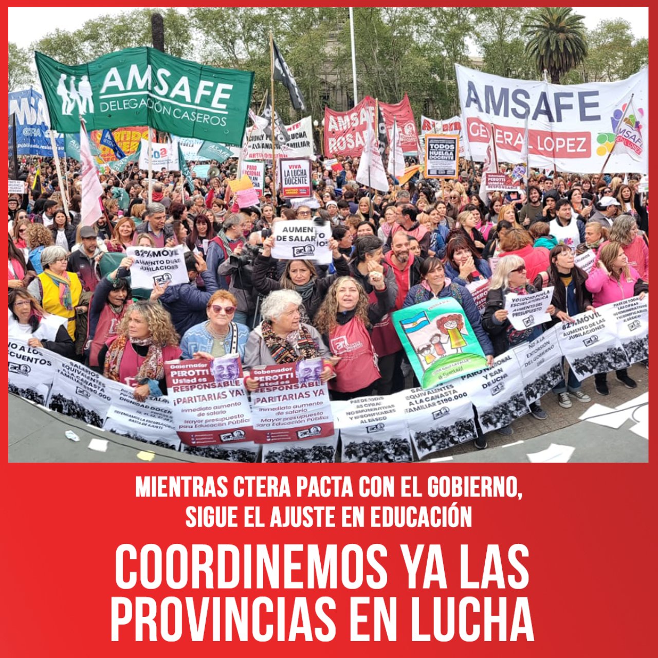 Un primer paso lo dimos con la conducción de Amsafe Rosario, que este martes 27/09 participó en un acto frente a la Casa de Santa Fe en CABA, en unidad con Ademys y los Suteba Multicolores. Llamamos a todas las conducciones combativas a convocar a una urgente reunión de coordinación de las provincias en lucha. Y que en cada asamblea y reuniones de delegados de los sindicatos que están en conflicto se plantee esta necesaria unificación nacional, para coordinar las medidas de fuerza de manera unificadas y con movilizaciones conjuntas.