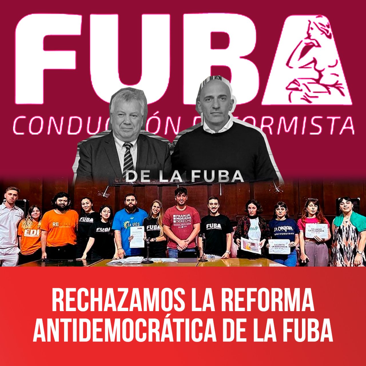 Sin previo aviso la agrupación Nuevo Espacio/Franja Morada, que dirige la FUBA, convocó a un congreso extraordinario el viernes 11 de noviembre para reformar el estatuto. Una reforma antidemocrática a espaldas del movimiento estudiantil, y sin contar con los delegados suficientes para que se vote (ya que Nuevo Espacio no tenía los 2/3 necesarios para una reforma del estatuto), refleja lo peor de la burocracia estudiantil que impulsó esta reforma sin precedentes. De esta manera, la pata estudiantil del vicerector Emiliano Yacobitti, en un paquete de reformas del estatuto, impuso que las autoridades de la FUBA ahora pasan a ser elegidas cada dos años junto a las elecciones obligatorias en las universidades, así les estudiantes perdemos nuestro derecho a poder elegir todos los años quienes serán nuestros representantes en nuestra federación. Esta reforma representa un ataque a derechos conquistados durante años por el movimiento estudiantil.