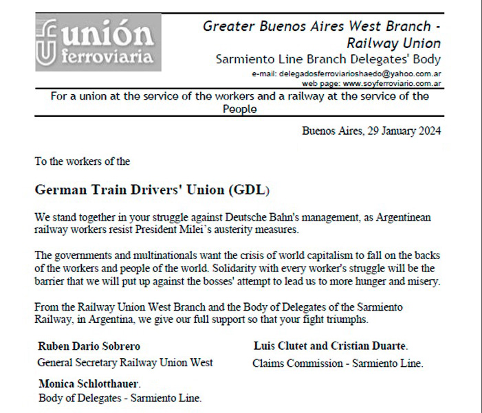 Carta enviada por las y los ferroviarios del Sarmiento en apoyo a la huelga