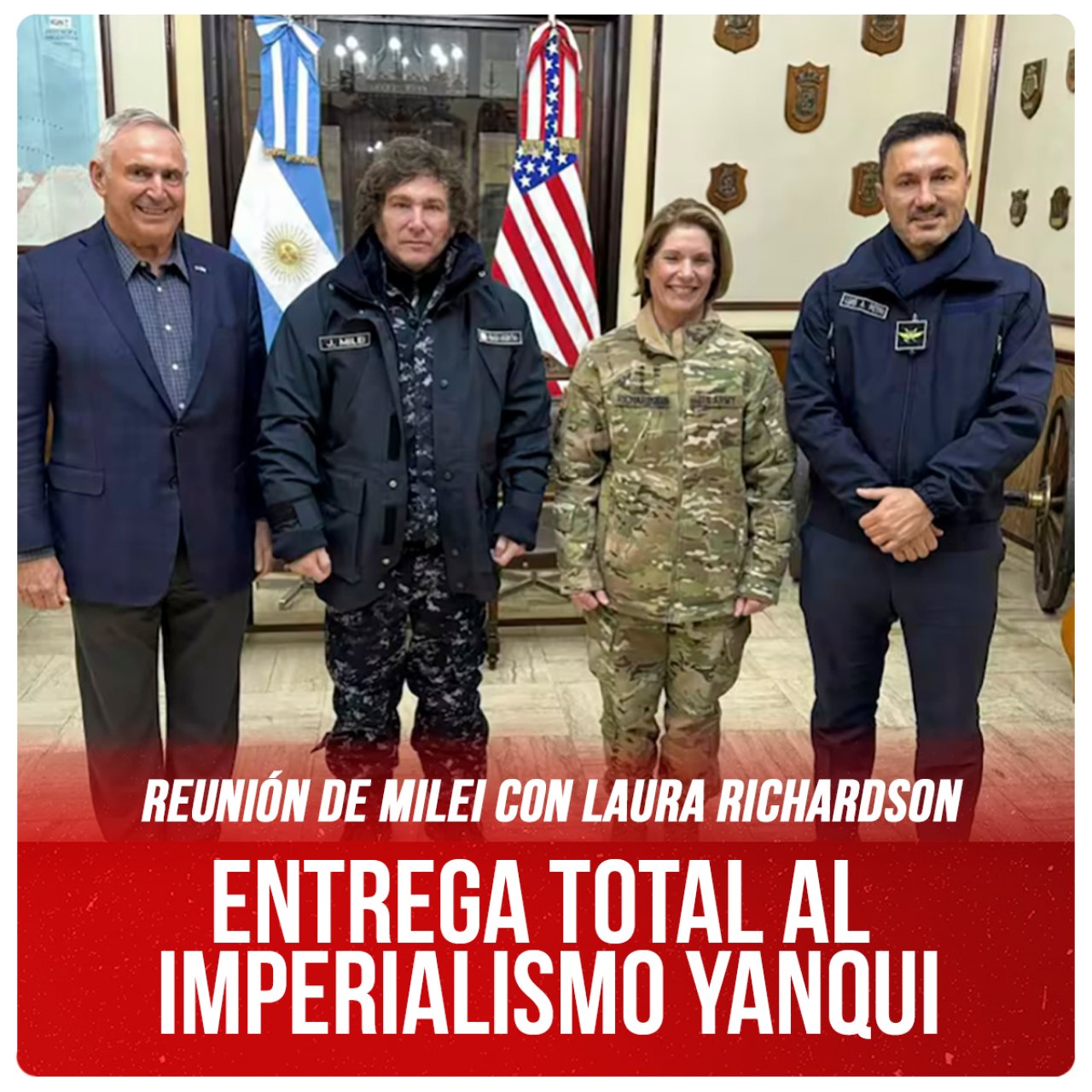 El presidente Javier Milei, con un ridículo disfraz militar de combate, viajó a Ushuaia a reunirse con Laura Richardson, jefa del Comando Sur del ejército estadounidense. Allí ratificó un alineamiento absoluto, que profundiza como nunca el carácter semicolonial de nuestro país.