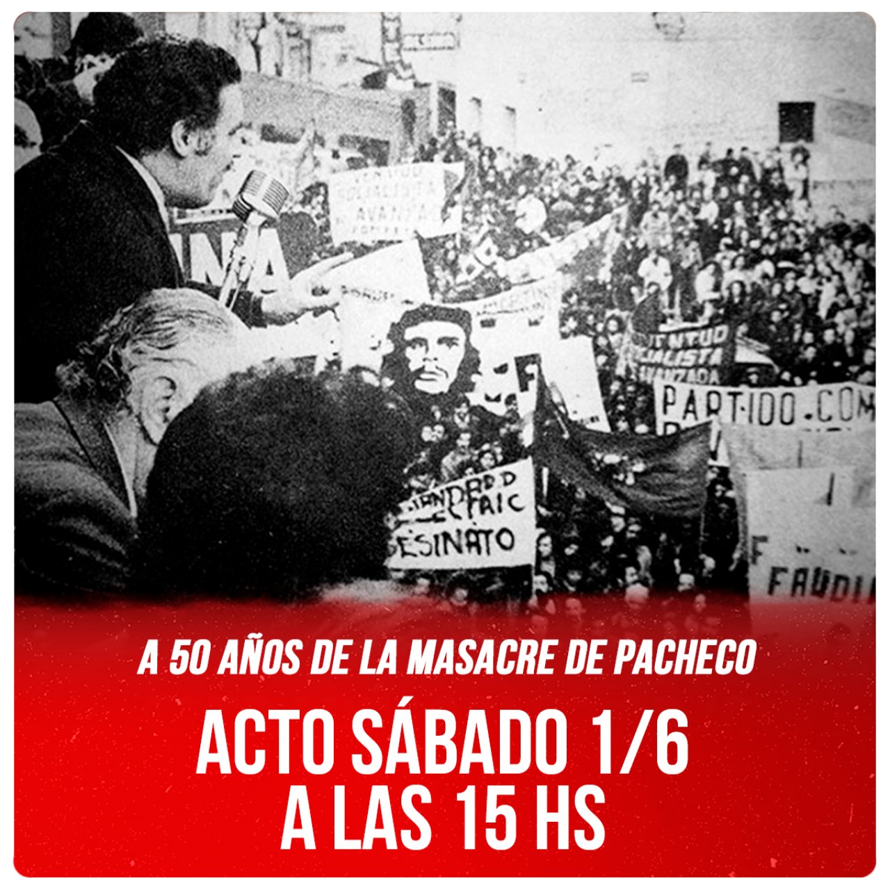 Con motivo de cumplirse el 50 aniversario del brutal ataque fascista sufrido por nuestro glorioso PST en el local de Pacheco, Izquierda Socialista realizará un acto en homenaje a los compañeros asesinados en esa ocasión. Será el próximo día 29 de mayo en el Auditorio de la Facultad de Ciencias Sociales a las 18 horas.