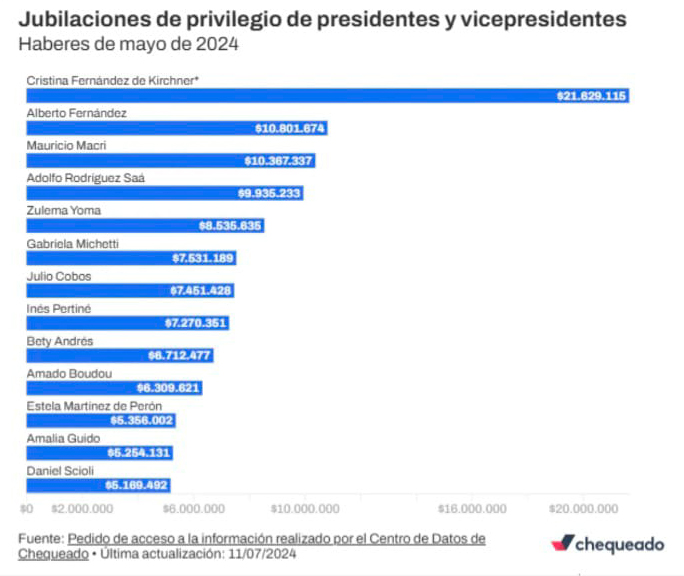 Es hipócrita la decisión del gobierno ultraderechista cuya intención, tras un golpe de efecto, es quedar bien con su base electoral y, de paso, intentar tapar su brutal ajuste. ¿Por qué le quita las jubilaciones de privilegio sólo a Cristina y Amado Boudou? La lista es larga. Las y los ex presidentes Alberto Fernández, Mauricio Macri, Cristina Fernández de Kirchner, Adolfo Rodríguez Saá y María Estela Martínez de Perón. Las y los ex vicepresidentes Gabriela Michetti (PRO), Amado Boudou (Peronista), Julio Cobos (Radical) y Daniel Scioli (Mileista). También perciben pensiones las viudas Inés Pertiné (Fernando de la Rúa); Zulema Yoma (Carlos Menem); Bety Andrés (Marcelo Levingston, presidente militar de facto) Amalia Guido (hija de José María Guido quien asumió la presidencia después del golpe militar a Frondizi).