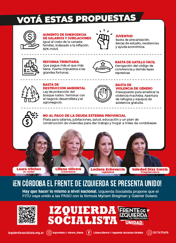 A pesar de esto, desde el Frente de Izquierda Unidad y en particular desde Izquierda Socialista desarrollamos una extendida e intensa campaña, recorriendo toda la provincia y llevando nuestra salida de fondo ante la enorme crisis que recorre el país y la provincia. Como dijo en el bunker nuestra candidata a gobernadora, Liliana Olivero, “los resultados electorales no deben hacernos perder de vista que los votos obtenidos por los candidatos patronales no son ningún cheque en blanco. En Córdoba se seguirán desarrollando luchas de las y los trabajadores, como sucedió con la docencia, o con salud, y seguirán encontrando en el FIT Unidad a la única fuerza que las apoya y las acompaña. El espejo en el que debemos mirarnos es el de Jujuy, porque todos los votos del peronismo y de Juntos por el Cambio son votos que serán usados para avanzar con el ajuste y la represión”.