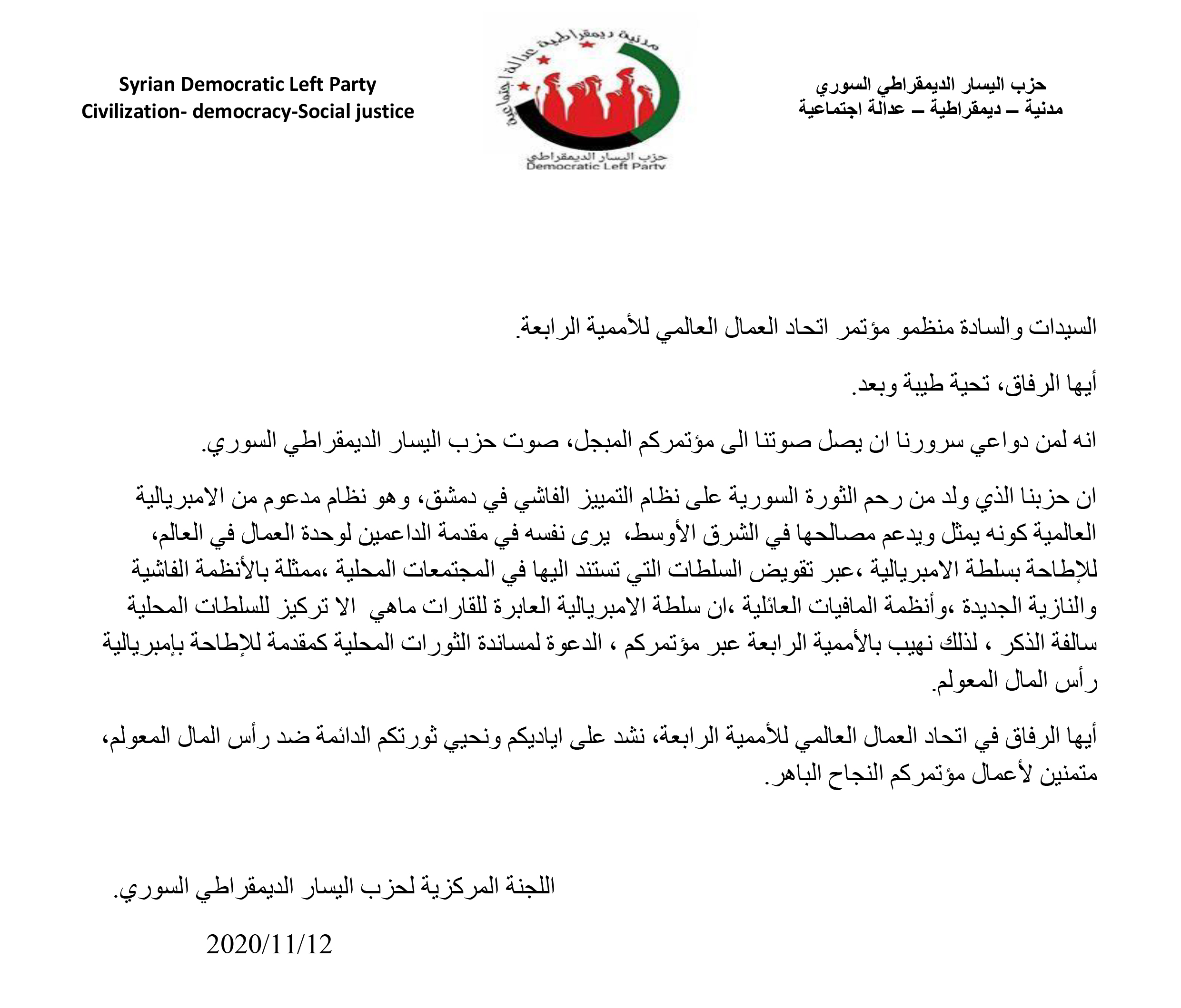 Es un placer para nosotros que nuestra voz, la del Partido de la Izquierda Democrática de Siria, llegue a vuestra conferencia.