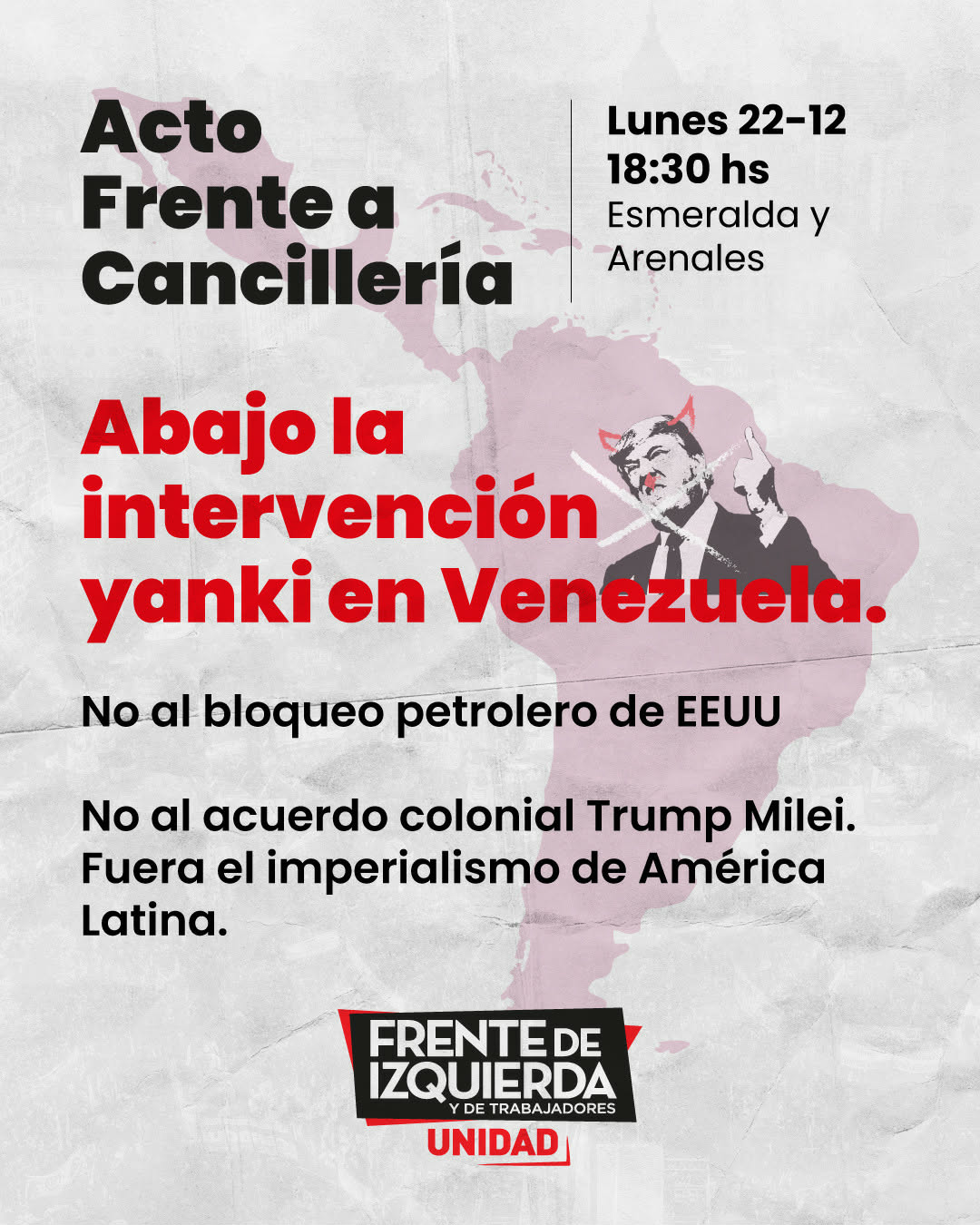 Este lunes 22 de diciembre a las 18:30 horas, frente a Cancillería (Esmeralda 1216, esquina Arenales - CABA), se llevará a cabo un acto convocado por el Frente de Izquierda Unidad para repudiar el bloqueo petrolero, la intervención imperialista de Estados Unidos contra Venezuela y el alineamiento de Milei una vez más con el ultraderechista Donald Trump.