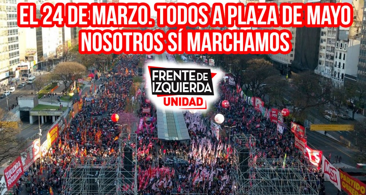 A 45 años del golpe genocida, el Frente de Izquierda-Unidad junto a distintas organizaciones independientes impulsa movilizaciones en todo el país este 24 de marzo. En oposición a la defección de los organismos ligados al gobierno del Frente de Todos de Alberto Fernández y Cristina de Kirchner y de la CGT y CTA, que han definido desmovilizar, hoy más que nunca rendimos homenaje a las y los 30 mil desaparecidos por la dictadura genocida y estamos de pie y en lucha contra todos los atropellos que sufren los trabajadores y sectores populares.
