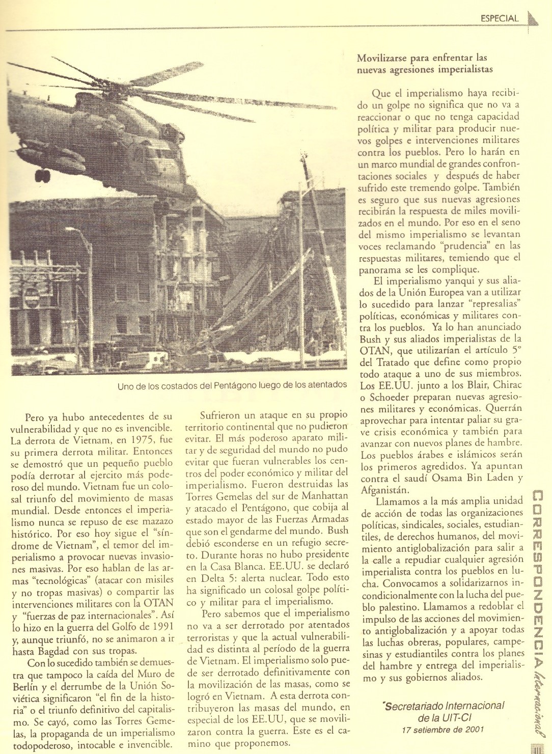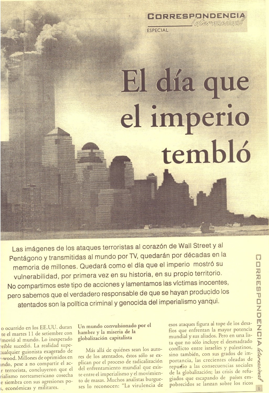 Las imágenes de los ataques terroristas al corazón de Wall Street y al Pentágono y transmitidas al mundo por TV, quedarán por décadas en la memoria de millones. Quedará como el día en que el imperialismo mostró su vulnerabilidad, por primera vez en su historia, en su propio territorio. No compartimos este tipo de acciones y lamentamos las víctimas inocentes, pero sabemos que el verdadero responsable de que se hayan producido estos atentados son la política criminal y genocida del imperialismo yanqui.