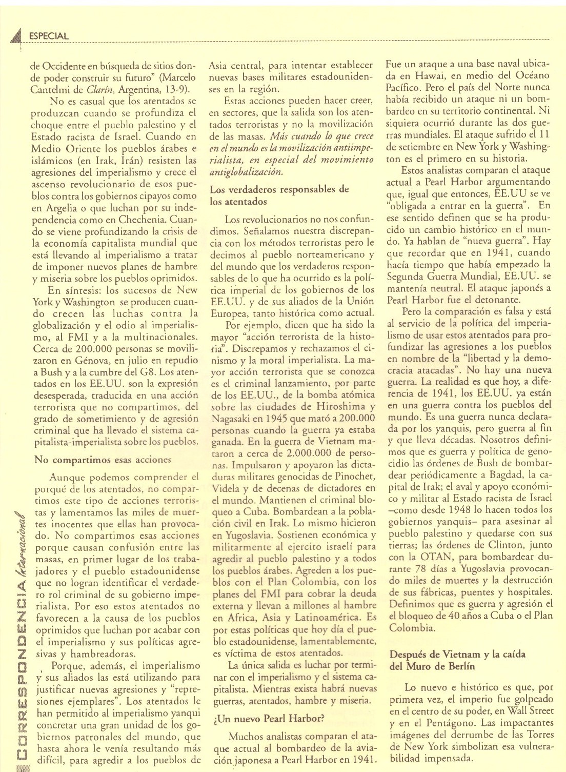 En síntesis: los sucesos de New York y Washington se producen cuando crecen las luchas contra la globalización y el odio al imperialismo, al FMI y a las multinacionales. Cerca de 200.000 se movilizaron en Génova, en julio, en repudio a Bush y a la cumbre del G8. Los atentados a los EE.UU son la expresión desesperada, traducida en una acción terrorista que no compartimos, del grado de sometimiento y de agresión criminal que ha llevado el sistema capitalista-imperialista sobre los pueblos.