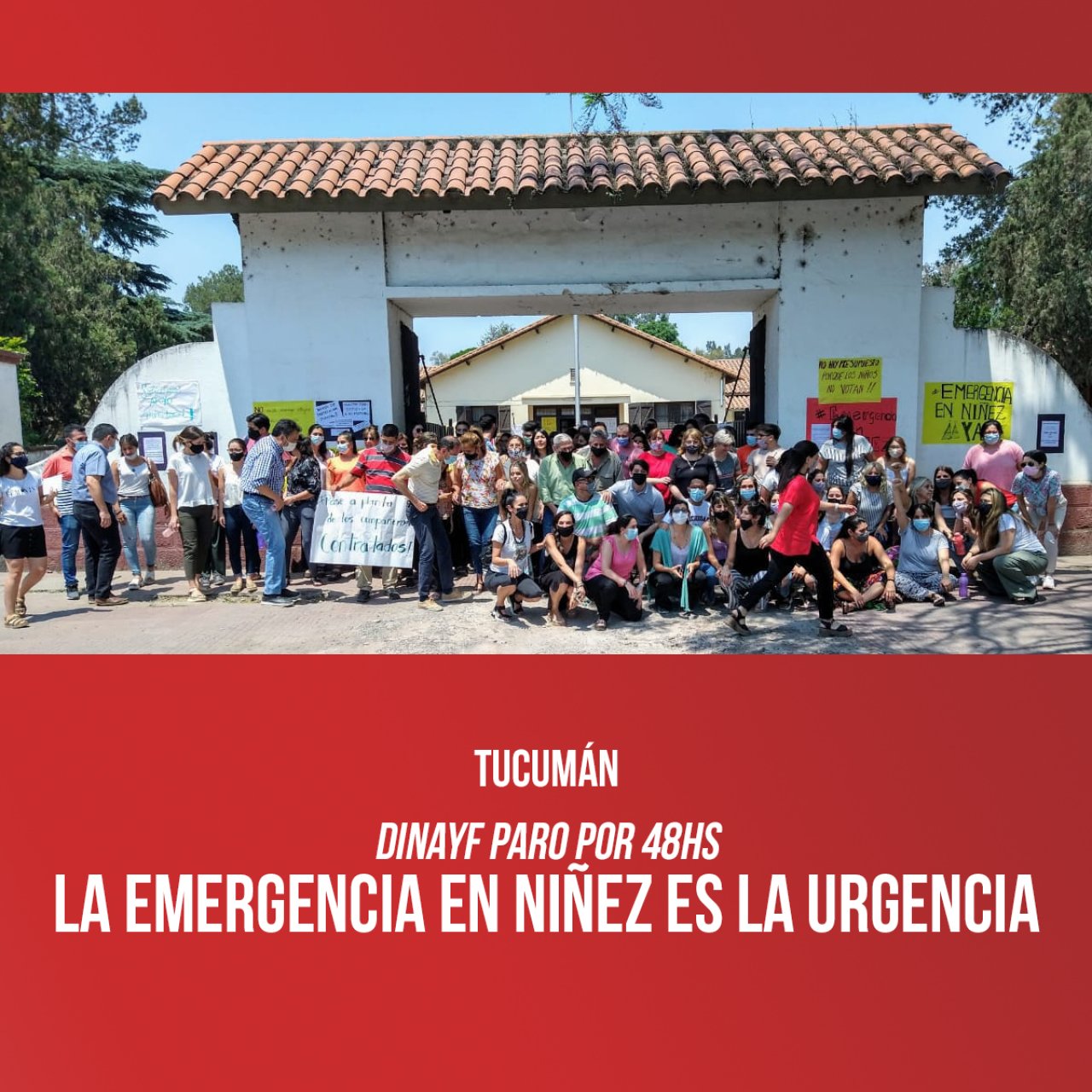 "Las y los trabajadores de la Dirección de Niñez, Adolescencia y Familia pertenecientes al Ministerio de Desarrollo Social de Tucumán, agrupados en el gremio de ATE seccional Tucumán, realizamos un paro por 48 hs, jueves y viernes, con asistencia a los lugares de trabajo y asambleas permanentes. Pero, sosteniendo la atención a emergencias".